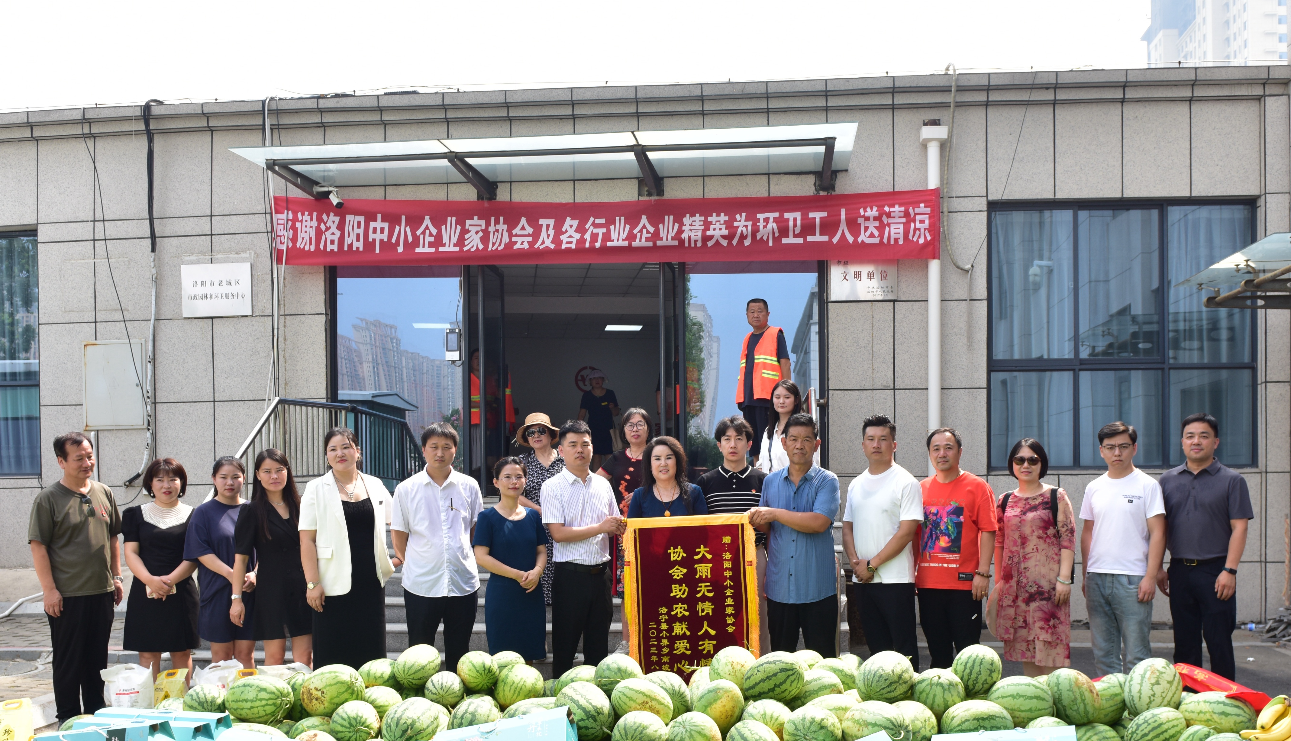 8月11日一大早,洛阳中小企业家协会会长张金苹带领洛阳中小企业家协会秘书长彭冬冬、副会长常晓龙、洛宁县小界乡南坡村党支部委员会、村民委员会、双桥村村党支部委员会、村民委员会、河南农购网洛阳运营中心、凤凰山生态纪念园、旗袍文化促进会、协会爱心企业家和社会爱心人士到老城区城市管理局共同看望慰问“环卫工人 送清凉献爱心”社会公益活动。
