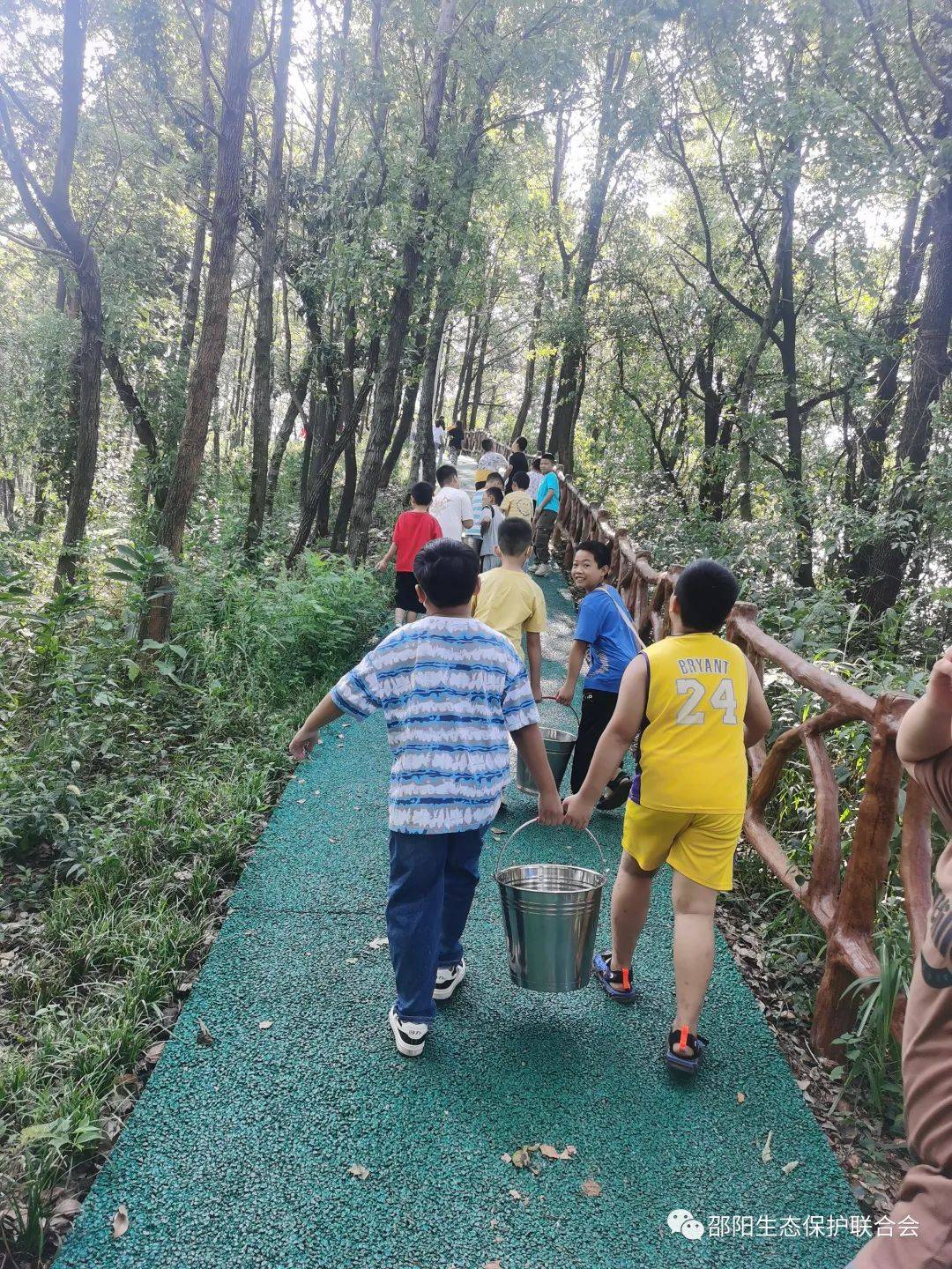 秋日骄阳,蓝天白云,佘湖山公园公益林一片繁忙。9月1日上午,新学期开学第一天,双清区佘湖小学五(2)班55名学生,在学校德育主任和班主任的带领下,提着水桶、端着水盆,来到佘湖山公益生态景观林浇树护树。