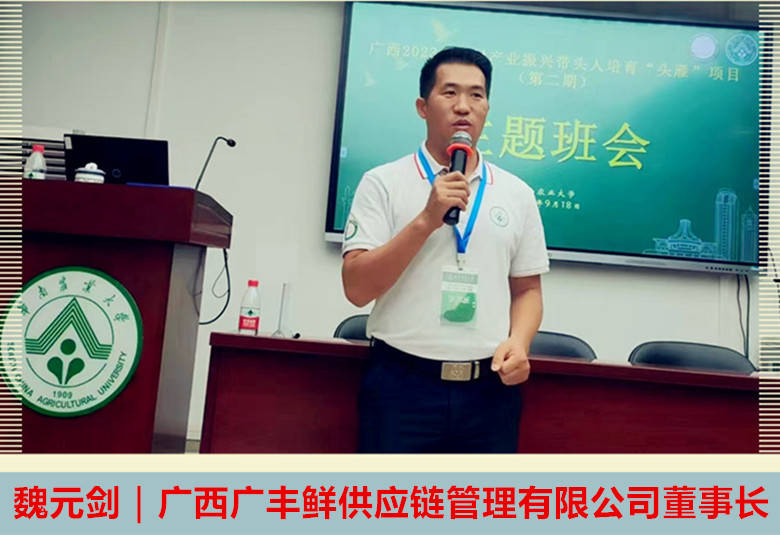 魏元剑,优秀退伍军人、广西靖西市第三届政协委员、靖西市零距离庄园电子商务有限公司总经理、靖西市大山之恋农产品批发中心总经理、靖西市味源生鲜连锁店总经理、广西靖乡农旅休闲农业有限公司总经理、广西广丰鲜供应链管理有限公司董事长、广西2023年乡村产业振兴带头人。