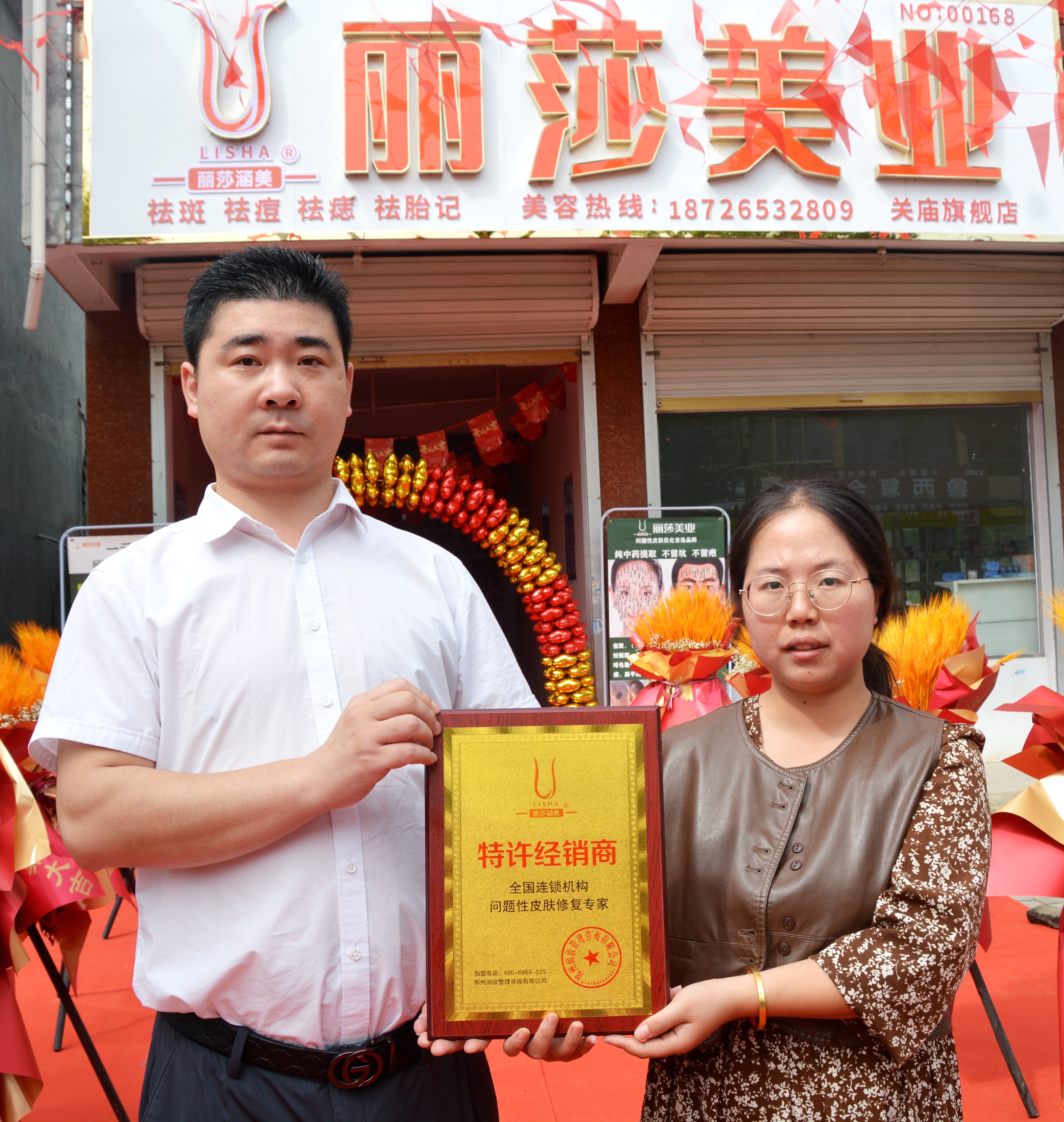 丽莎美业《丽莎涵美》品牌总裁为关庙镇旗舰店负责人张换换授牌。
