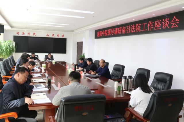 10月7日,南阳市中级人民法院审判委员会专职委员王付令、清算与破产审判庭负责人任万富、环境资源审判庭庭长龚跃伟一行到南召县人民法院调研指导工作并召开座谈会,南召法院领导班子成员及部分部门负责人陪同调研并参与座谈。