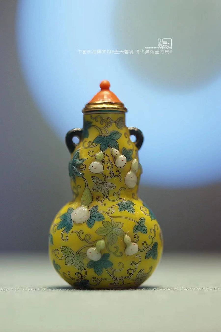 葫芦形,直口溜肩、双系耳、束腰凹底。底署红料“乾隆年制”篆书款。涅白玻璃上施黄地珐琅彩,通体绘枝叶繁茂的葫芦。大葫芦上还凸雕九个小葫芦,葫芦长蔓,有连绵不断之意,寓意多子多福,江山永续。