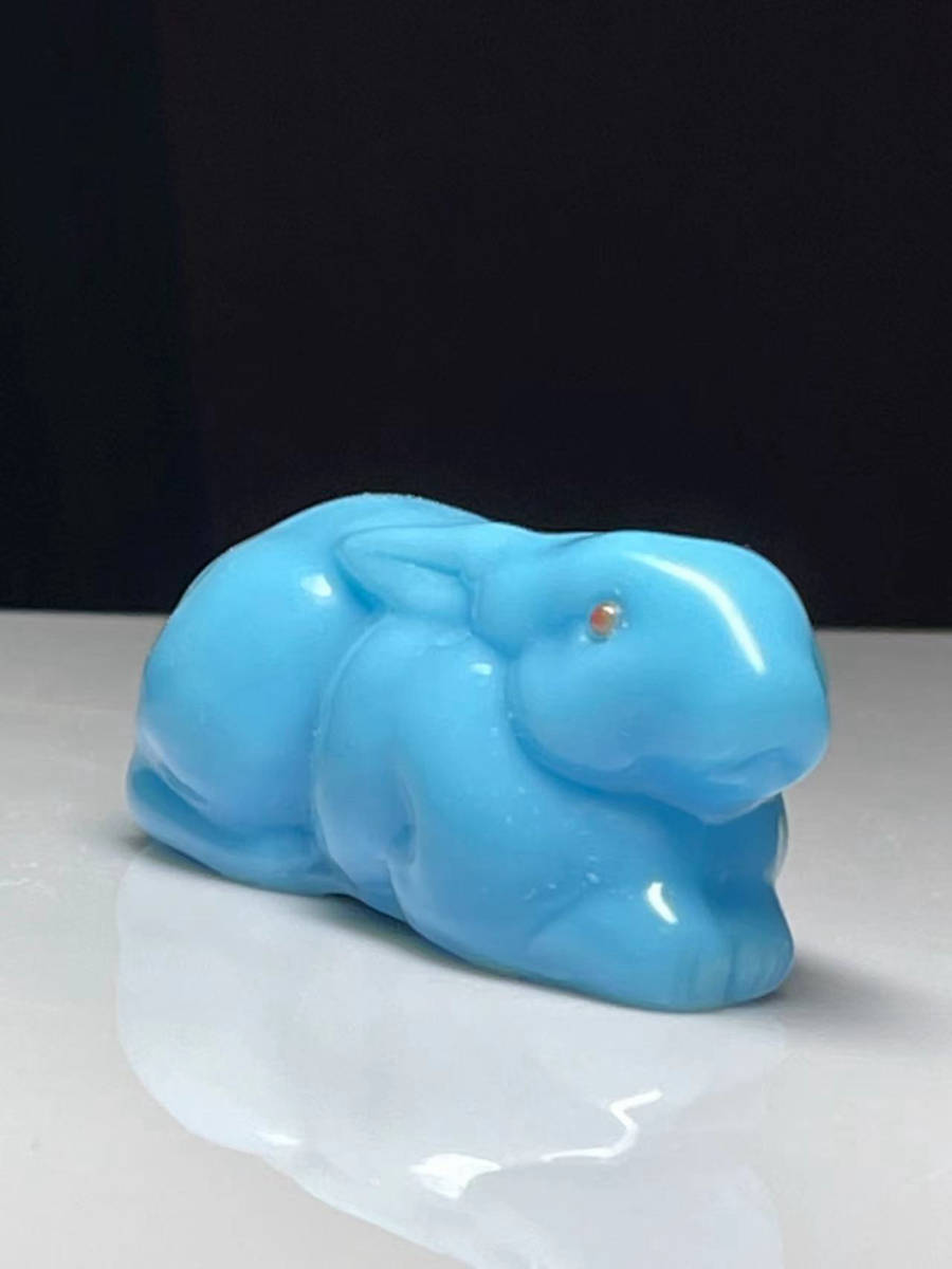 此件动物造型纸镇在玻璃器中不多见,天青色的颜色,纯净优雅,丰满的肌理,红红的小眼睛,配上兔子可爱的造型,实在称得上是文房用具中,一件不可多得的匠心之作。好的镇纸既实用,又有艺术欣赏性,特别是摆设很讲究的书房里,镇纸在体现主人爱好、情趣等方面,有画龙点睛之妙。此免形纸镇,精彩绝伦,极其珍贵。
