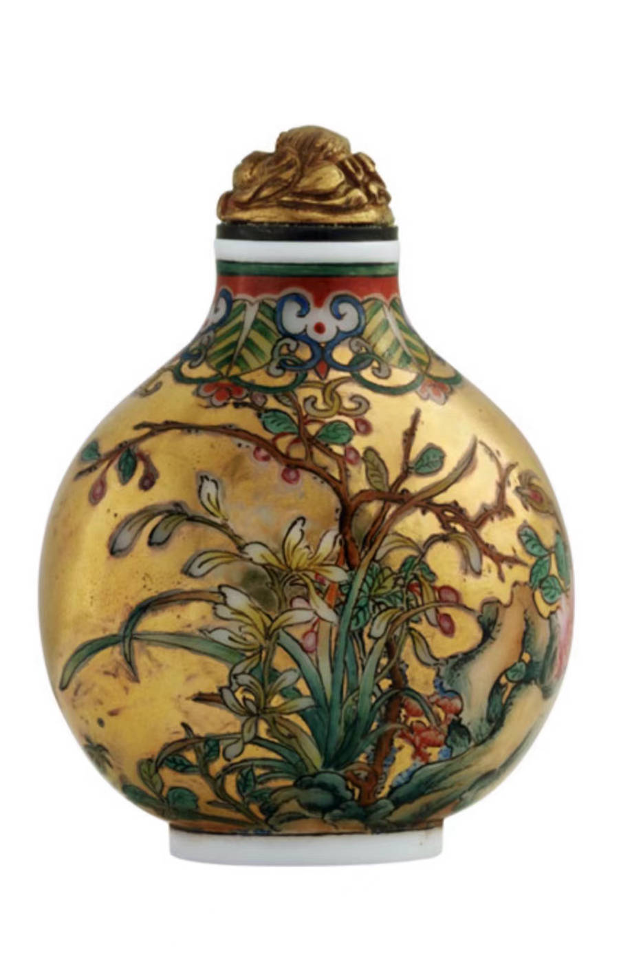 鼻烟壶通体饰以金地,整体造型优雅富贵,显示出皇家御用器的富丽堂皇。是宫廷造办处玻璃厂的典范之作。与之纹饰相近、工艺相同的鼻烟壶故宫仅存三件,非常之珍贵。
