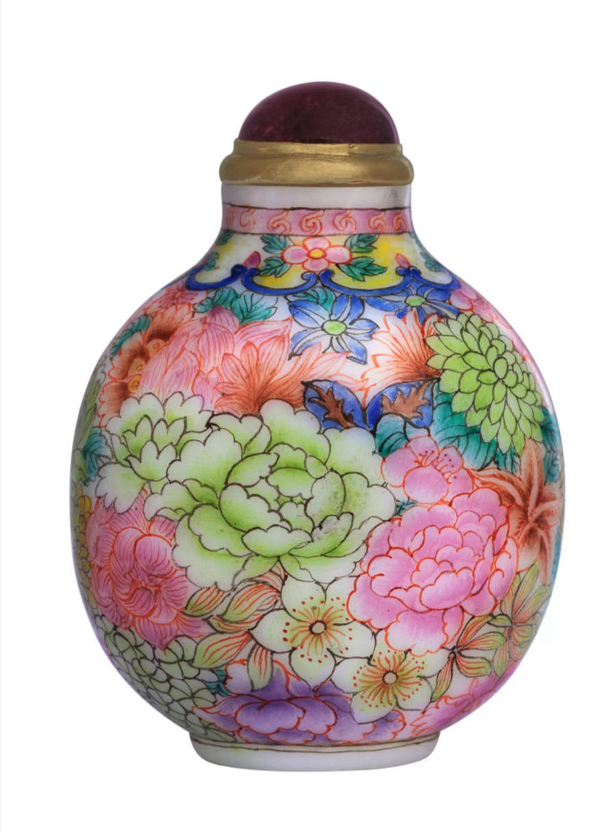 此壶画风典雅,自然流畅,整体用色清新淡雅,繁而不乱,珐琅釉料细腻轻薄,颜色品种丰富多变,应该是早期的进口珐琅釉料。珐琅彩,始创于康熙晚期,专供御用或皇室玩赏,成本高产量少,连宠臣也不会轻易赏之,在清宫众多艺术珍品中至为珍贵。雍正珐琅彩更是皇冠上的明珠,全世界目前所知的只有台北故宫博物院珍藏唯一一件竹节式鼻烟壶。可想而知这件鼻烟壶的珍稀程度。