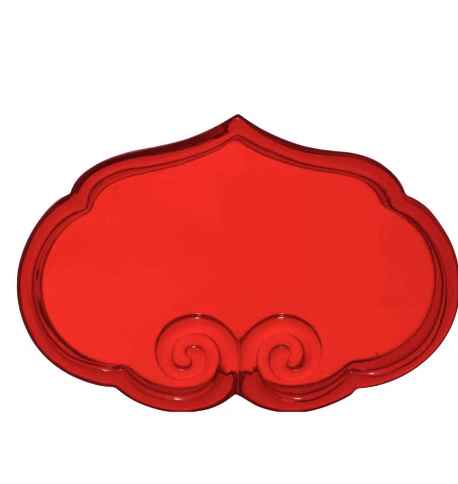 盖盒呈如意形,分盖、底两部分。子母口,圈足。通体为透明宝石红色。