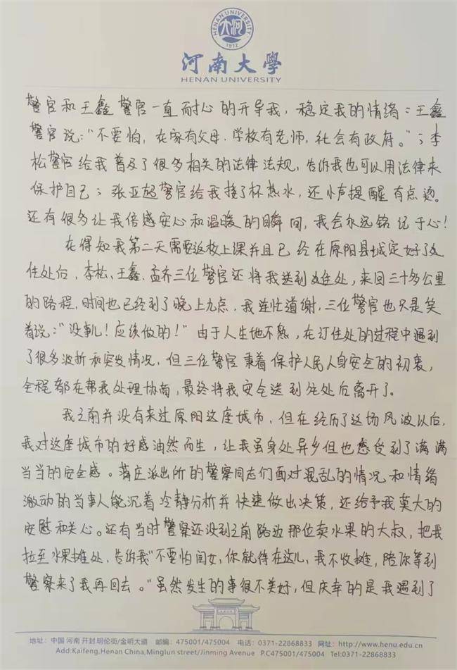 近日,原阳县公安局收到一封来自河南大学一名学生的信件,内含一封手写感谢信,字里行间的纸短情长、情真意切,这些包含深情的赞许和鼓励既是对原阳警方辛勤付出的高度认可,也是激励民辅警再接再厉的强大动力。