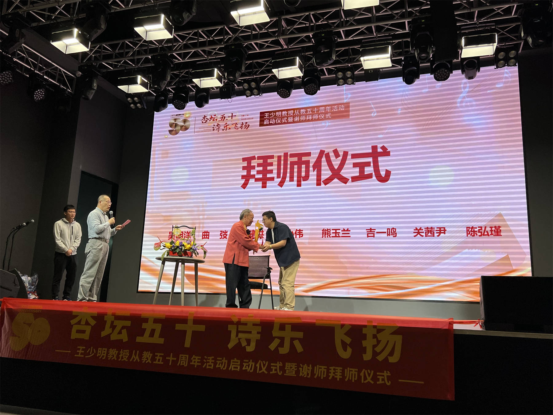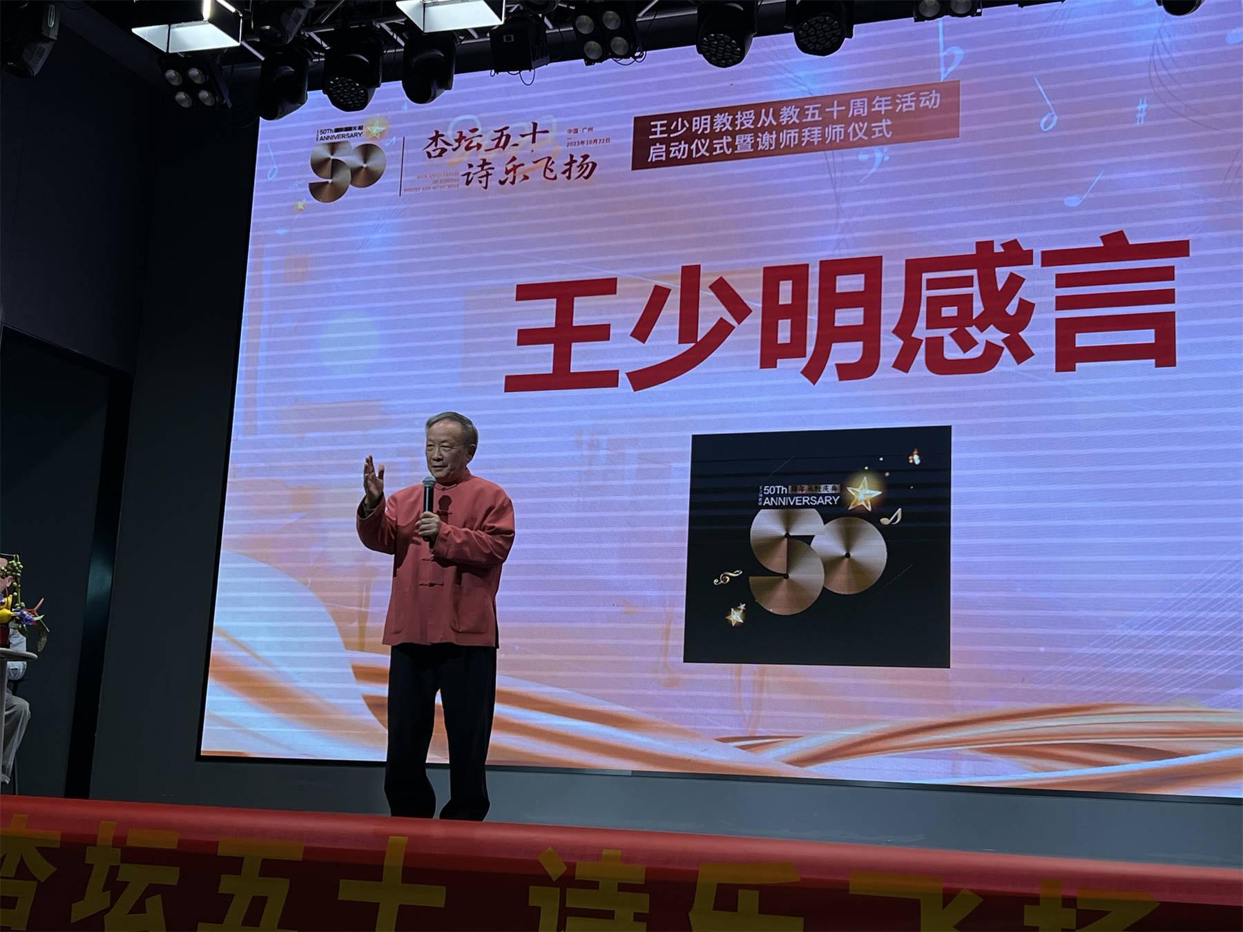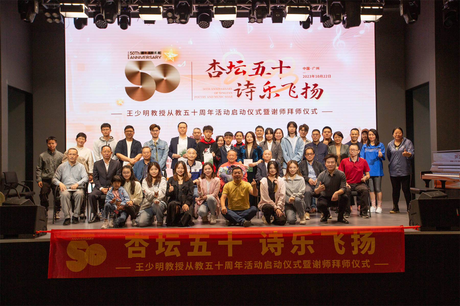 2023年10月22日上午10时,由广东省文化学会主办、广州市音乐家协会承办、星海音乐学院音乐学系、五音国际艺术教育协办的“杏坛五十,诗乐飞扬”——王少明教授从教五十周年活动启动仪式暨谢师拜师仪式在岭南音乐馆隆重举行。到场致辞庆贺的有文化界、教育界专家、学者及王少明教授的家人好友、历届学生代表。本场启动仪式由中流会创始人、富有幽默感的姚军先生主持。