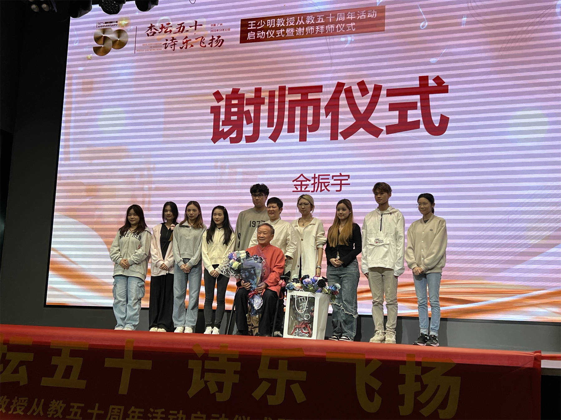 本次仪式为王少明教授从教五十周年系列活动拉开序幕,《南方之歌——张三的诗、思、情》和《一代匠哲——赵宋光学术思想研究论文集》两本新书的发布仪式将在12月2日14:30举行。王教授的学术座谈会与作品音乐会将分别于12月10日上午9:30与下午15:00举行。本次系列活动内涵丰富、形式多样,是王少明教授从教五十年成果的又一次展示。祈愿王少明教授从教五十周年系列活动圆满成功!