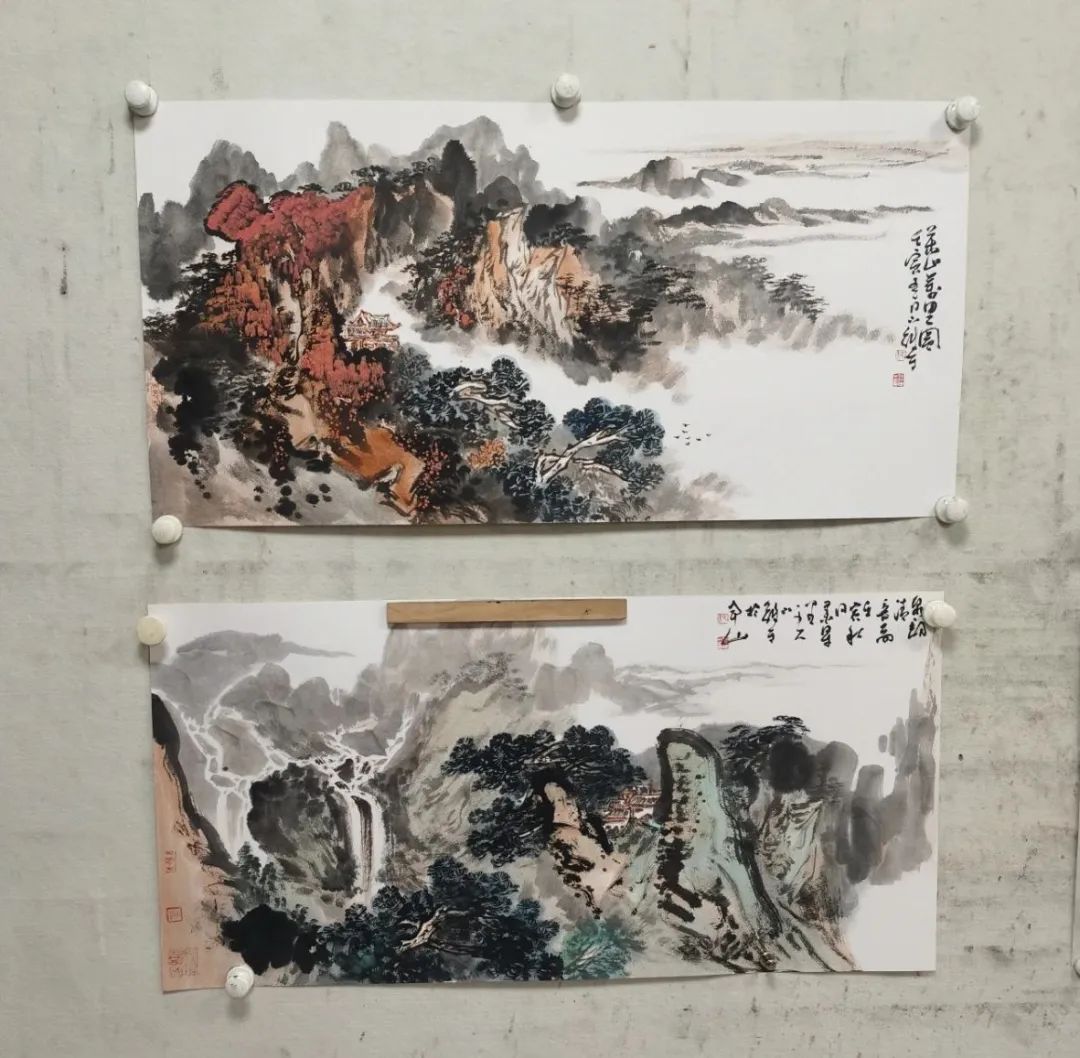 沈书记在镇上还建有一个工作室。工作室里有沈书记的书法和绘画作品,也有他的老师朋友的书画作品,还有沈书记收藏的各种各样的泰山石。长长的画案,画案上的笔墨纸砚各种颜料,以及四周墙壁上挂满的画作,让我们看到画家书记作为画家的一面。