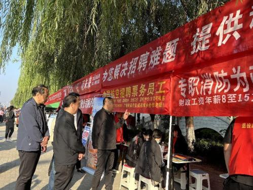 封丘县退役军人事务局局长刘玉海、县人社局局长孙银忠一行沿着招聘展位一边走一边看,不时驻足在企业招聘台前,与用工企业工作人员深入交流。
