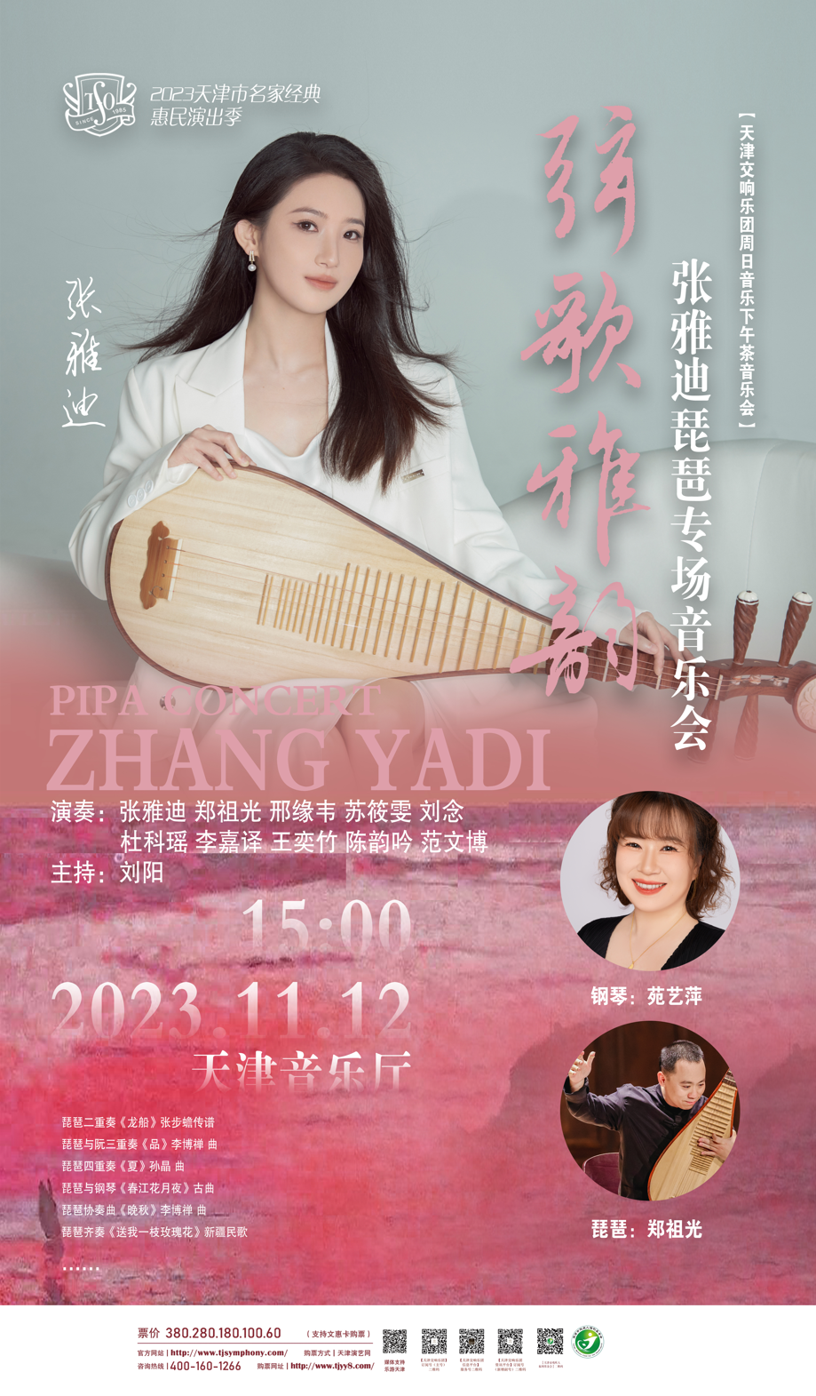 11月12日,天津交响乐团“周日音乐下午茶”推出“弦歌雅韵”——张雅迪琵琶专场音乐会,特邀青年琵琶演奏家、天津音乐学院教师张雅迪领衔,联袂钢琴演奏家苑艺萍、青年琵琶演奏家郑祖光等献上精彩演出。音乐会曲目既有传统名曲,也有当代经典;既有琵琶与西方乐器钢琴的中西合璧,又有琵琶与大阮、大鼓等传统乐器的交相辉映,带领观众共度一场穿越古今的琵琶音乐之旅。