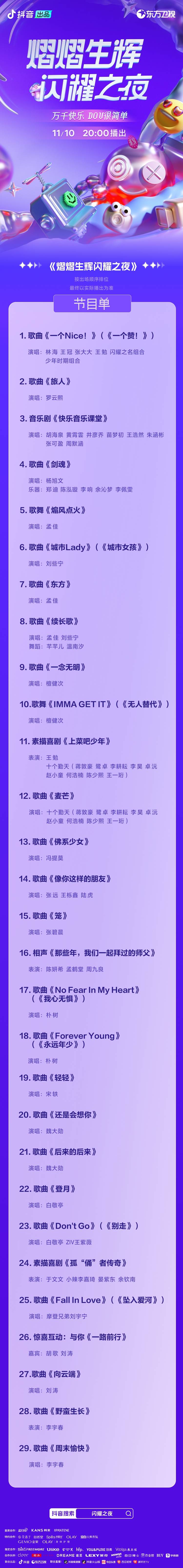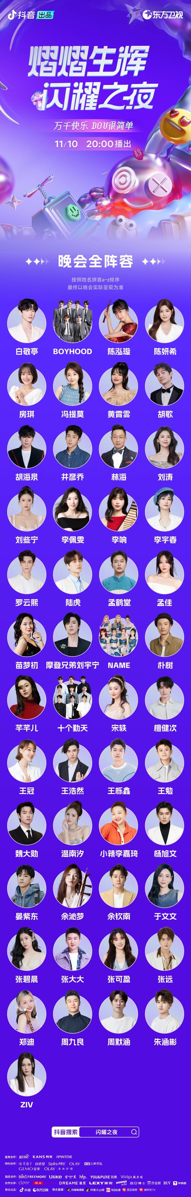 在《2023抖音熠熠生辉闪耀之夜》里,欢乐依旧是不变的主旋律。别出心裁的“喜剧show”+“歌舞表演”模式,点燃整晚的热情!白敬亭、陈妍希、房琪、冯提莫、胡歌、胡海泉、黄霄雲、刘涛、刘些宁、刘宇宁、李嘉琦、李宇春、罗云熙、陆虎、孟鹤堂、孟佳、朴树、十个勤天、宋轶、檀健次、王栎鑫、王勉、魏大勋、杨旭文、晏紫东、余钦南、于文文、张碧晨、张大大、张远、周九良(按照a-z字母排序)等40余组知名艺人将与抖音优质民乐、舞蹈主播同台表演,共同带来一场喜剧与歌曲交相辉映的欢乐晚会。抖音平台也将全程直播闪耀之夜,让所有的快乐0时差上演!