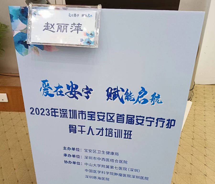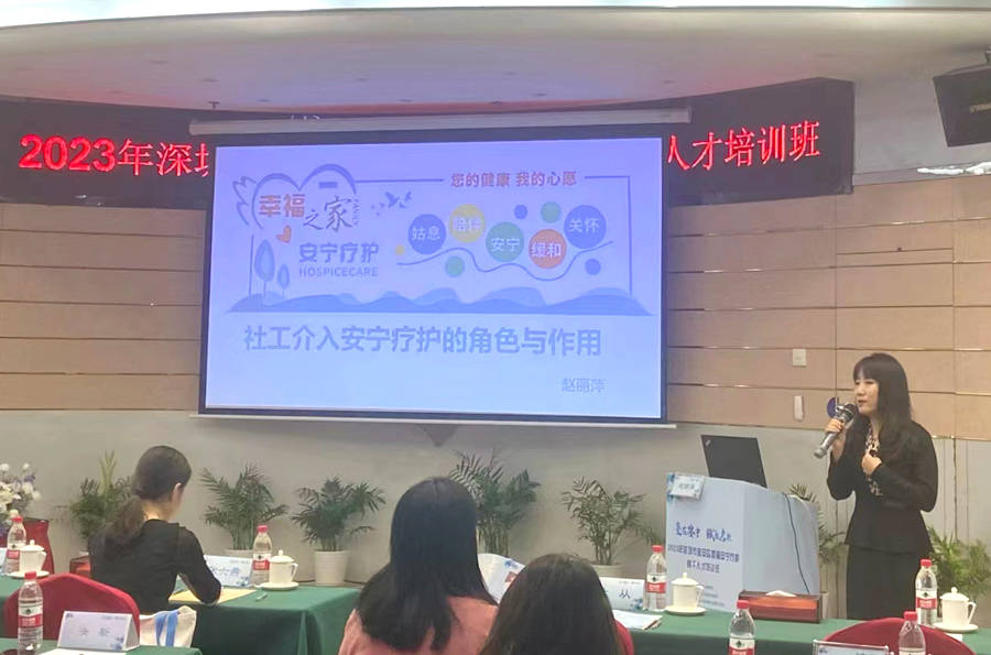 2023年11月12日上午,公益人赵丽萍受深圳市中西医结合医院邀请参加深圳市宝安区首届安宁疗护骨干人才培训班活动,并就“社工介入安宁疗护的角色与作用”话题作了精彩分享。