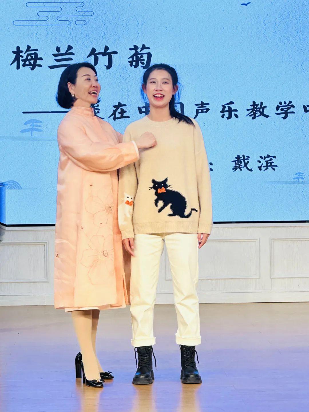 讲座过程中,戴滨教授循循善诱、精准指导,让聆听的学生和老师受益匪浅。多年来,戴教授立足共性化声乐训练的基础,进行个性化演唱风格探索,积极挖掘演唱者身上最独特的闪光点,教学手段灵活多变、因材施教,形成了独具特色的教学风格和教学方法。她提出的“在对立矛盾统一的辩证思维中平衡点线面的声音构架”“情境设计结合深悟作品内涵启发式引导式教学”“个性化挖掘与演唱风格定位”等教学理念,快速有效地解决了声乐教学难题,拓宽了教学思路,提高了演唱水准,更是培养出众多在“金钟奖”“文华奖”“CCTV青歌赛”“全国高等艺术院校声乐大赛”“国际华人艺术节”等国内外重大比赛中获奖的声乐表演人才和各大高校、教育系统的优秀声乐教育工作者。戴滨教授学生共同创建“戴上金花”艺术实践团队,打造“音画乐间·梅兰竹菊系列音乐会”艺术实践品牌,力求植根于中国声乐的传承与发展,为学生的艺术实践发展提供更多的平台。