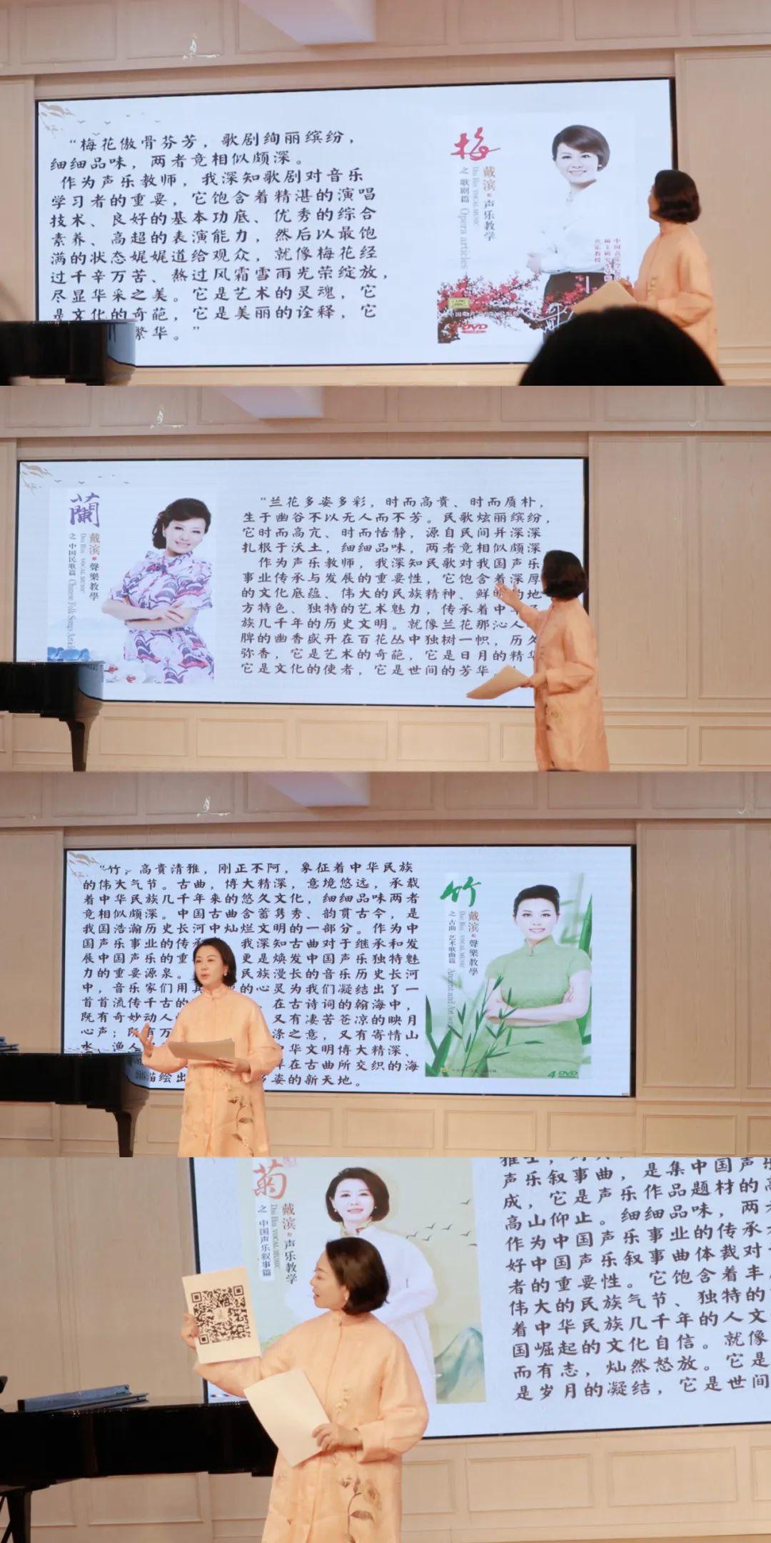 在戴滨教授看来,梅花傲骨芬芳,歌剧绚丽缤纷,细细品味,两者竟相似颇深;兰花多姿多彩,时而高贵、时而质朴,就像民歌一样,源自民间并深深扎根于沃土;竹,高贵清雅,刚正不阿,恰如古曲,博大精深,意境悠远,承载着中华民族几千年来的悠久文化;菊,清风傲骨,幽芳逸致,中国声乐叙事曲,是集中国声乐艺术造诣之大成,它是声乐作品题材的高峰,风华绝代,高山仰止。戴滨教授用中国声乐歌唱中国故事,以科学性、时代性、民族性、艺术性为宗旨,在共性的基础上充分展现出声乐作品的个性色彩和文化内涵。