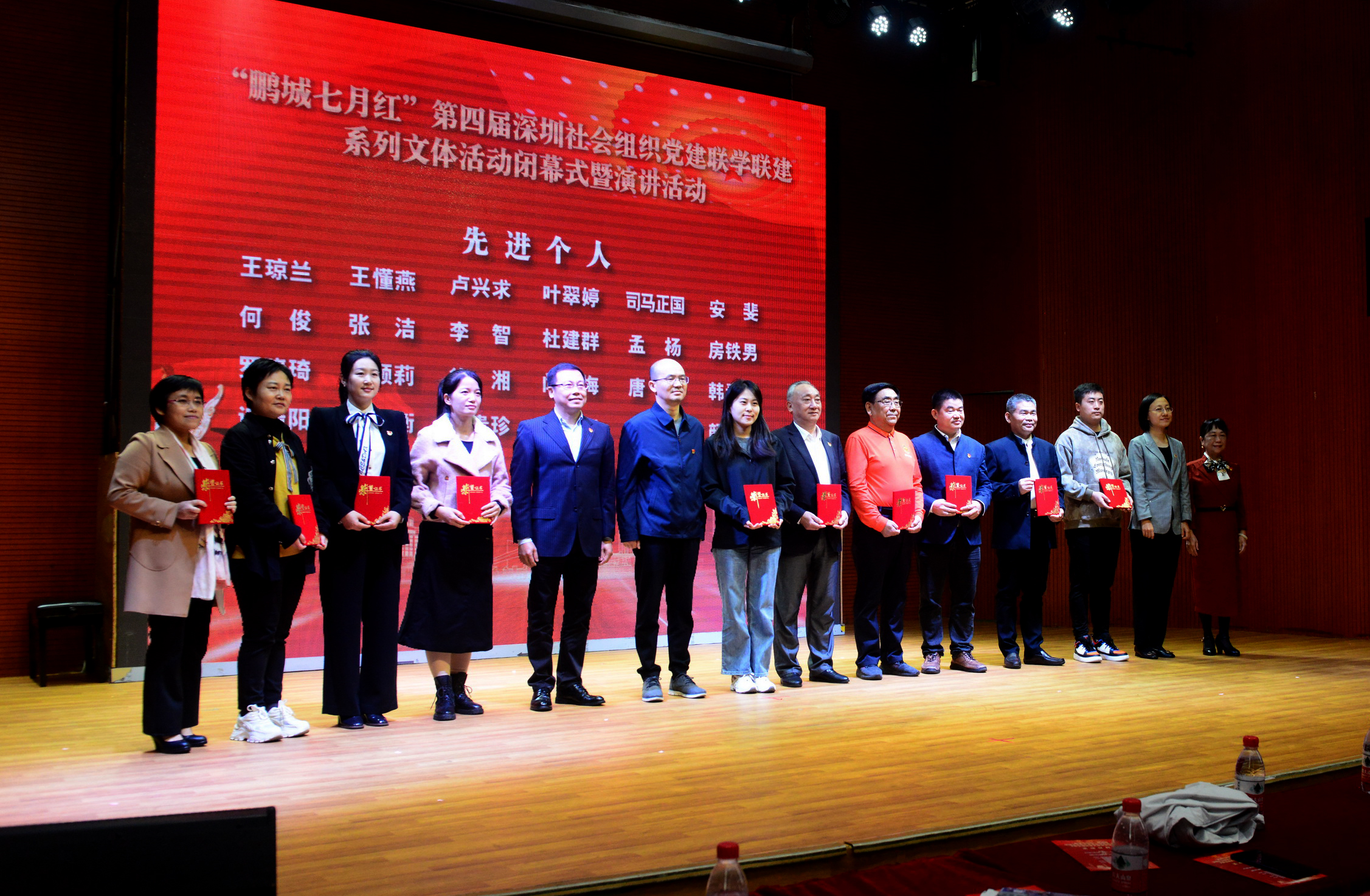 深圳市文创体育类社会组织联合党委第一书记兼党委书记、深圳市公共文化促进会党支部书记杨素贤;深圳市质量创新社会组织联合党委第一书记郭晓渝;深圳市社会组织总会联合党委副书记兼纪委书记张武波,深圳市社会组织总会联合党委副书记、深圳市注册建筑师协会党支部书记张一莉;深圳市社会组织总会党支部书记、执行会长苏建东;深圳市社会组织总会联合党委办公室主任胡应;深圳市文创体育类社会组织联合党委副书记兼纪委书记肖泽宇;深圳职业技术大学经济学院党委副书记席丽娟以及各直属党支部党员、群众代表、演职人员等近三百余人参加本届闭幕式活动。