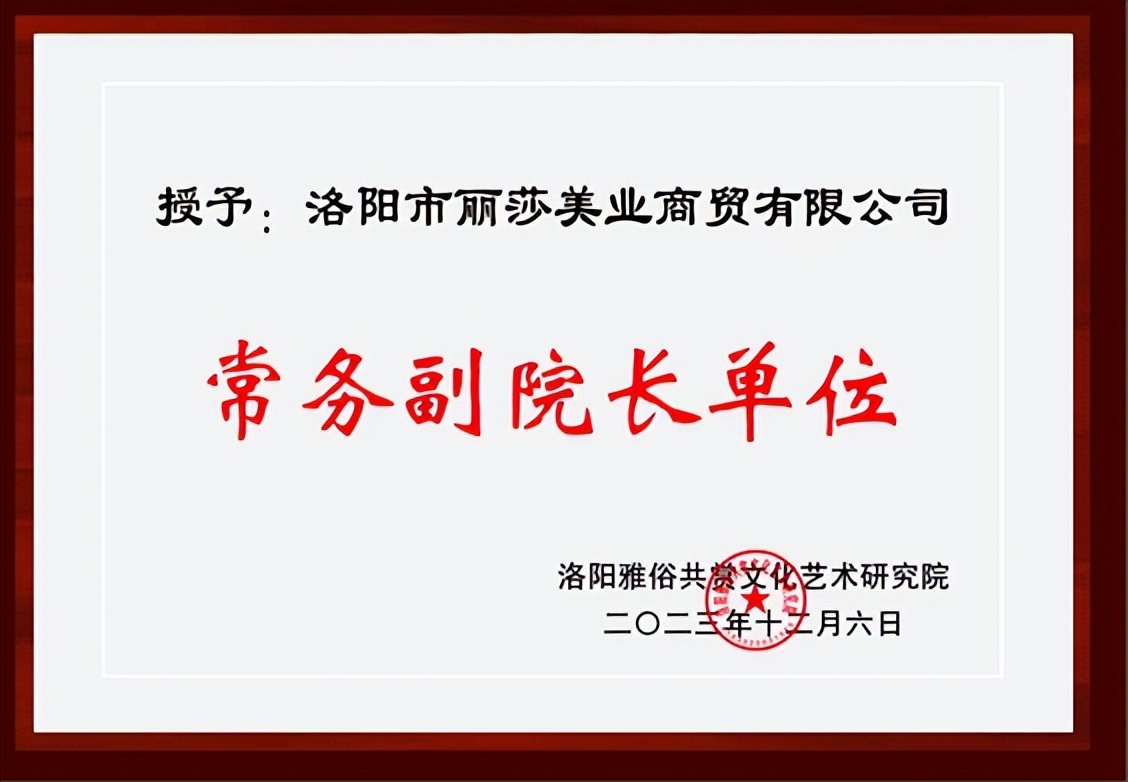 "洛阳中小企业家协会副会长单位" "2023年12月6日荣获洛阳市雅俗共赏文化艺术研究院常务副院长单位授牌"等一系列授权和荣誉证书。