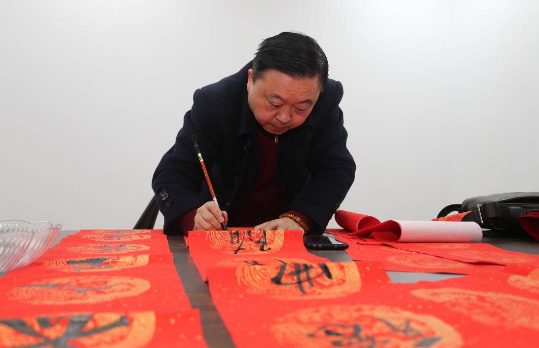 中国明星书画院贵州分院院长梁家辉现场为群众写春联