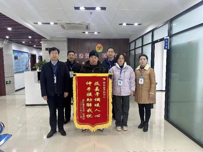 12月21日,获嘉县位庄乡居民刘某来到获嘉县矛调中心,送上一面“获嘉矛调暖人心 伸手援助解我忧”的锦旗,对老同志们调解其母亲意外摔伤赔偿一案的辛勤付出表示感谢。