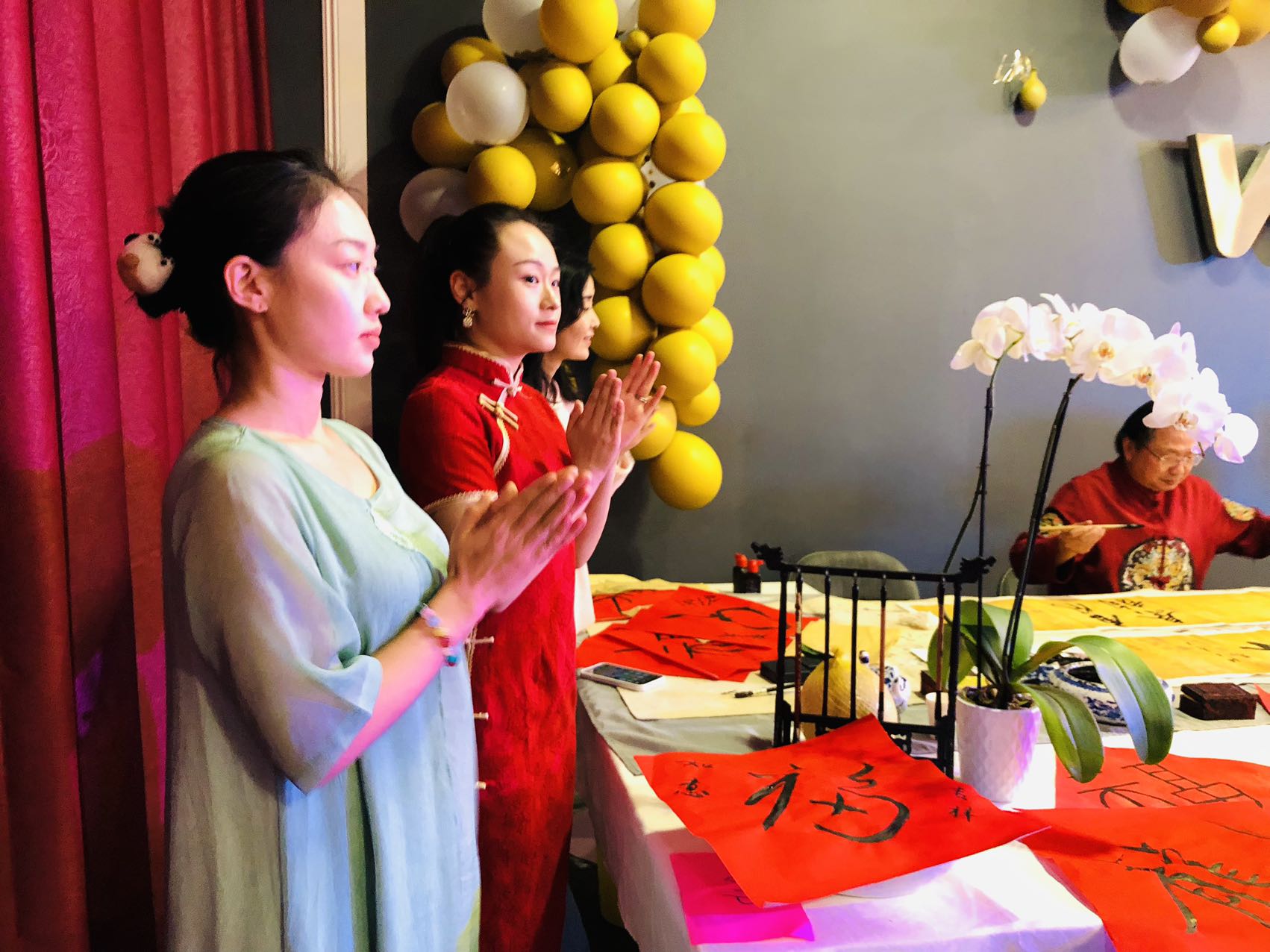 活动当天, 这三位同好很早就来到了多元文化中心, 她们静静地坐在书画交流桌前, 心静地书写迎春吉祥“福”“吉祥”等字. 在活动开始之后, 她们特地换上了民族服装, 挥毫有法度, 运笔多韵味, 有模有样, 吸引了不少的来宾观赏.