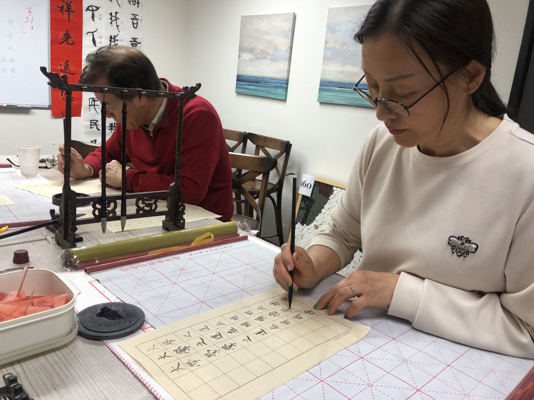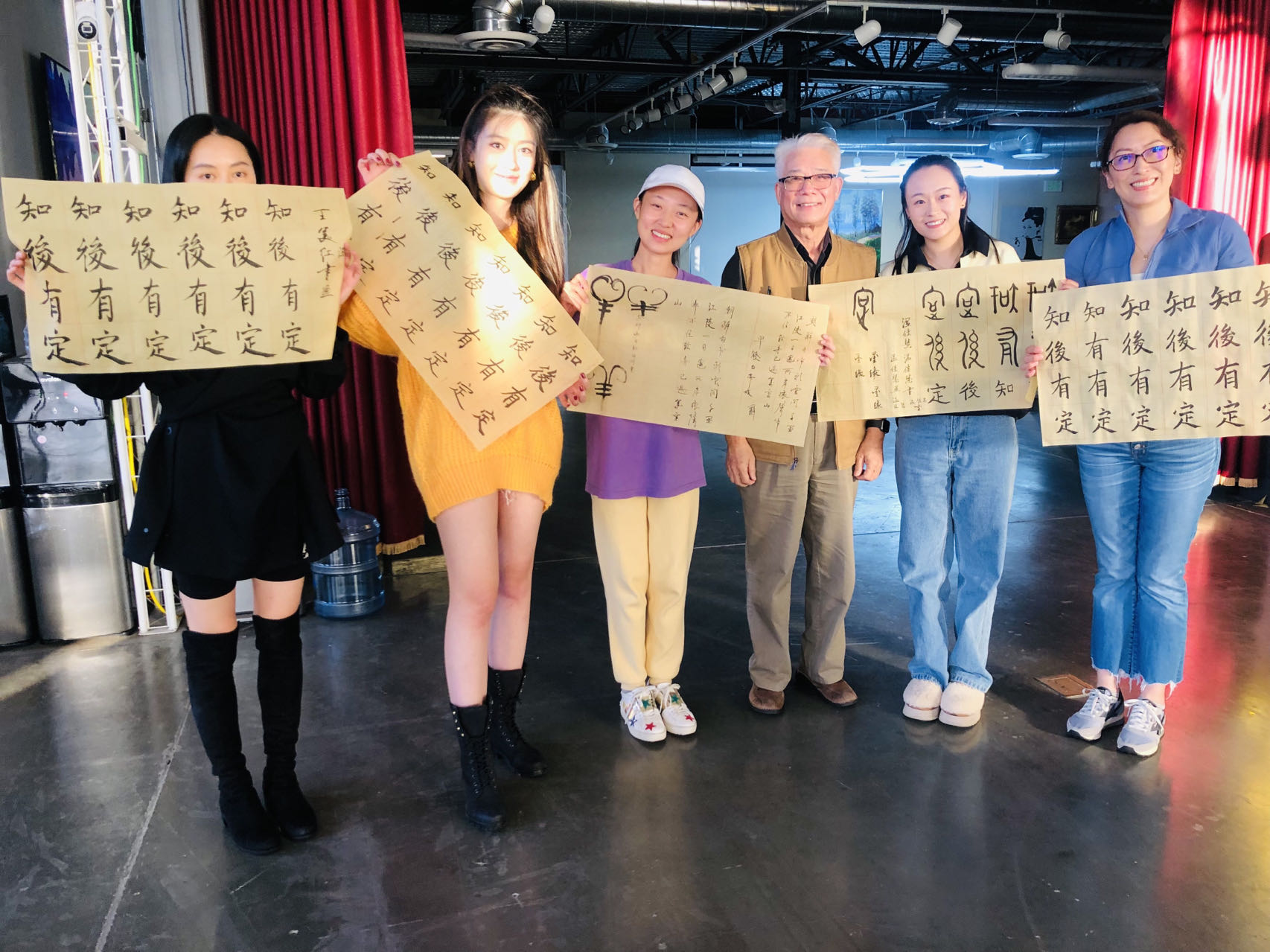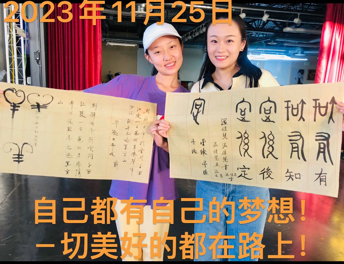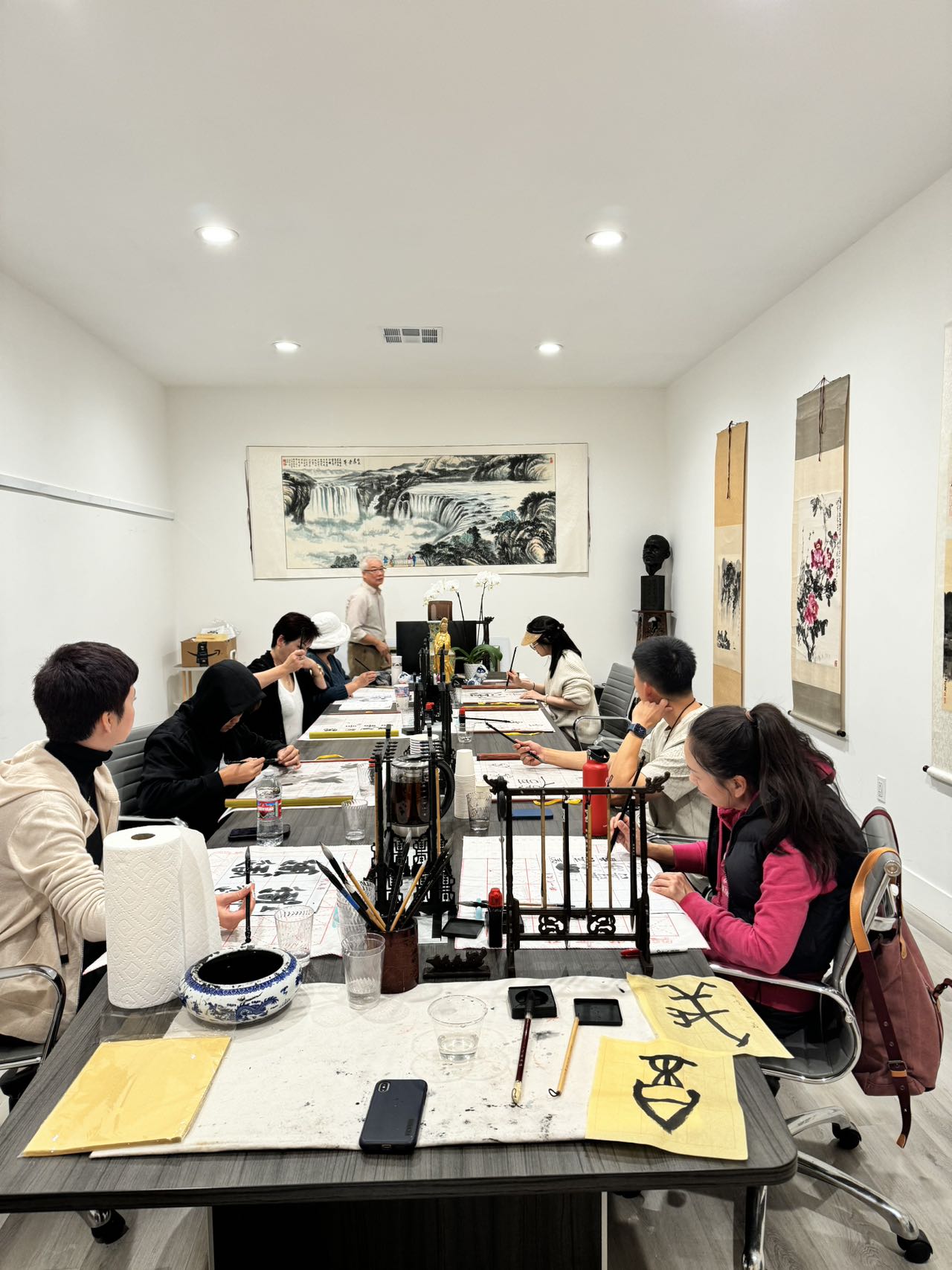 目前我在南加州尔湾每周共有三个中国毛笔字书写研讨班, 周一是尔湾政府的长者中心书法课, 周四为心灵平静抄经班, 还有一个规模人数较多的周六班, 加上在大公园中文学校的儿童班, 还有开在《文渊阁》郝老师书画艺术廊的国学书法课, 疫情结束之后一年中, 前前后后一共举行了108期, 平安夜前的12月23日周六, 仍有年轻同仁前来研讨学习, 而参加陕西经贸文化交流会的苗苗, 佳慧, 悠然就是这些班级中的代表.