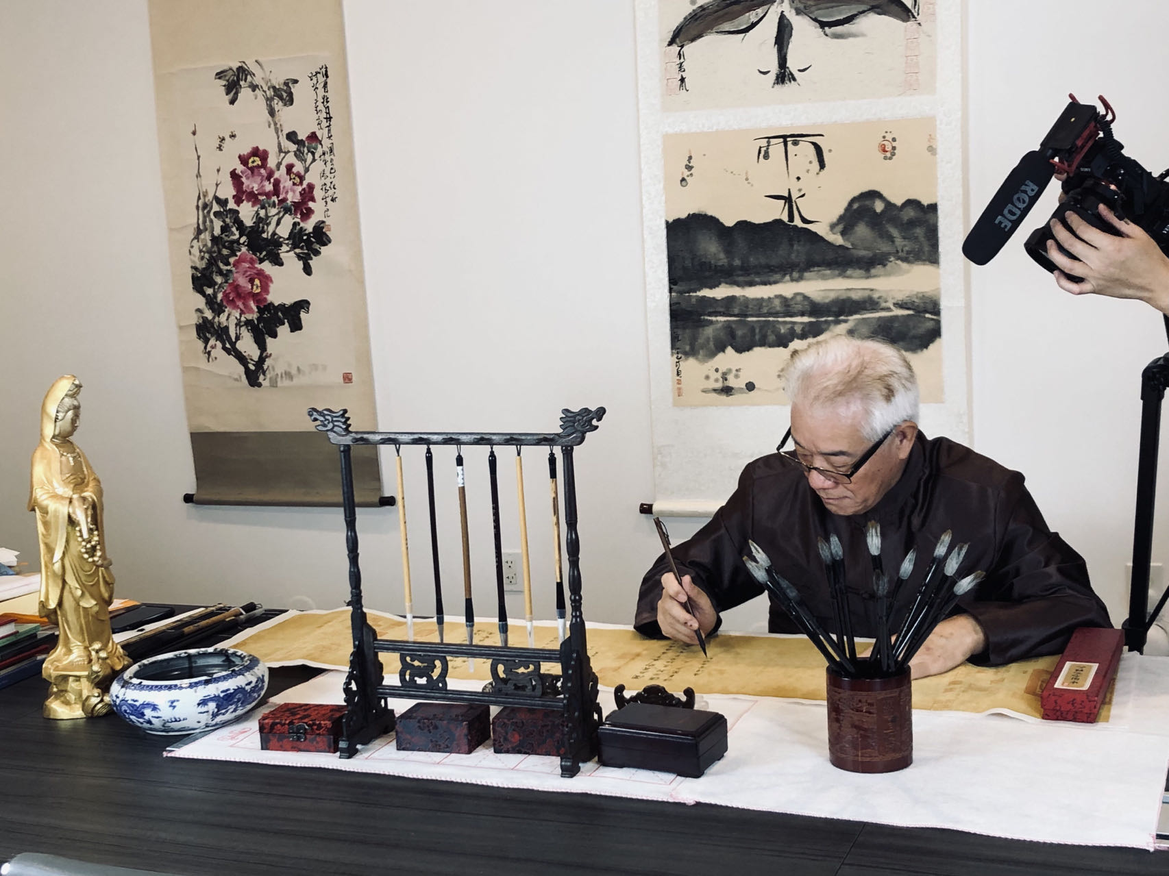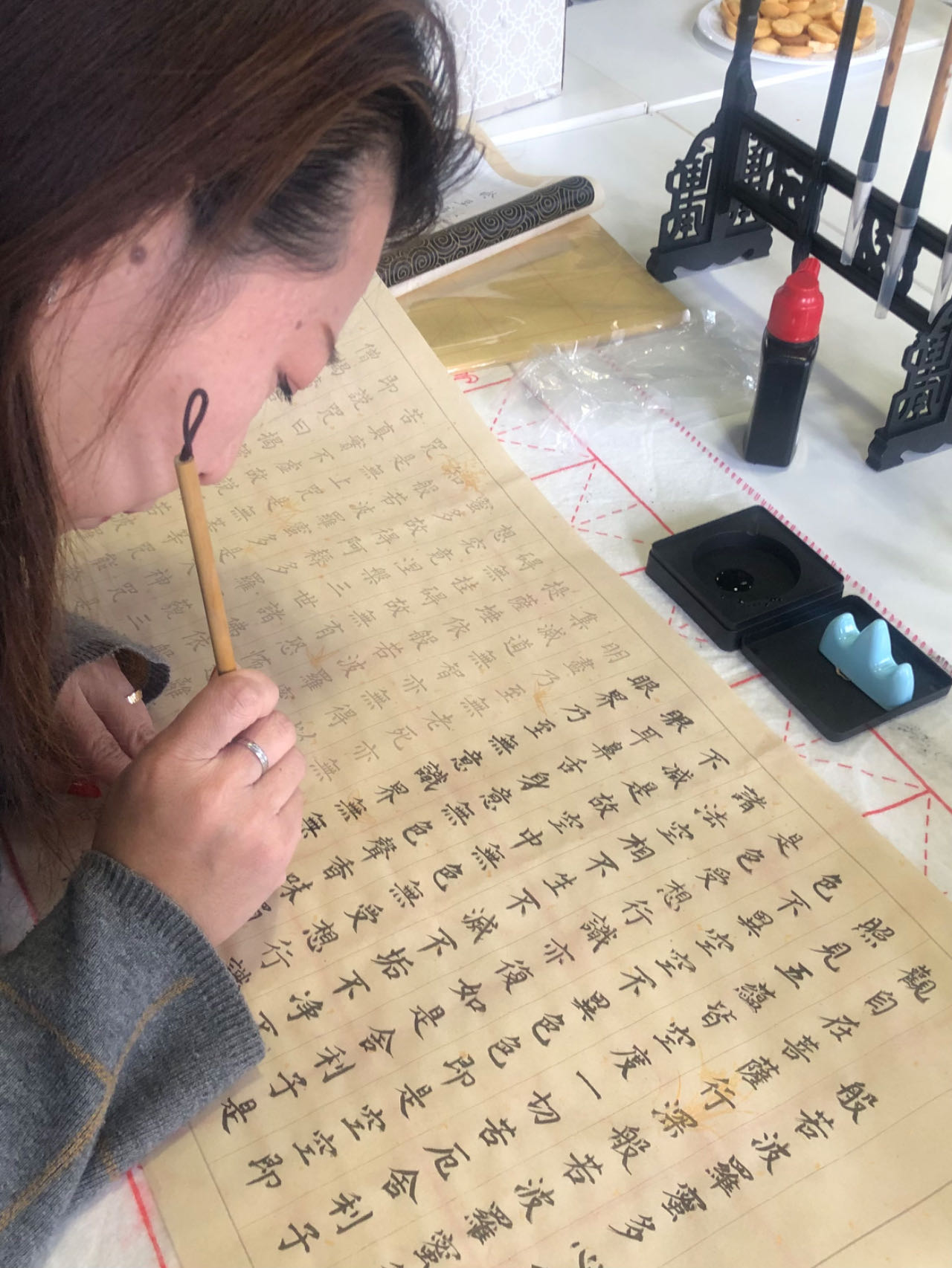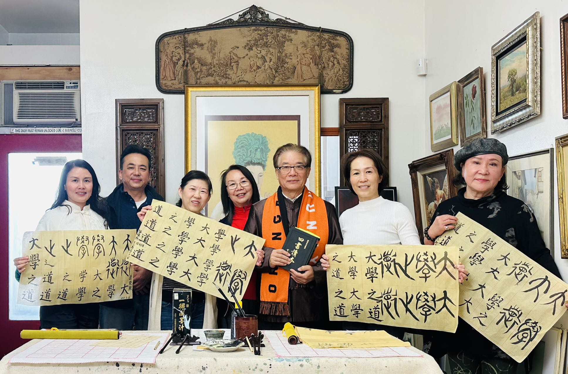 目前我在南加州尔湾每周共有三个中国毛笔字书写研讨班, 周一是尔湾政府的长者中心书法课, 周四为心灵平静抄经班, 还有一个规模人数较多的周六班, 加上在大公园中文学校的儿童班, 还有开在《文渊阁》郝老师书画艺术廊的国学书法课, 疫情结束之后一年中, 前前后后一共举行了108期, 平安夜前的12月23日周六, 仍有年轻同仁前来研讨学习, 而参加陕西经贸文化交流会的苗苗, 佳慧, 悠然就是这些班级中的代表.