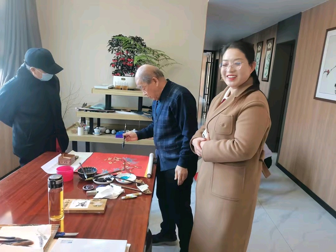 玉兔呈祥辞旧岁,金龙献瑞迎新春。在2024年新春佳节即将到来之际,济宁市老年书画研究会的书画家们,在会长李振华和常务副会长常继双、郑守生的带领下,冒着滴水成冰的严寒天气,于2024年1月25日上午,走进优秀民营企业——山东圣大建设集团一分公司,为基层的员工们写春联,送福字,献墨宝,送文化到基层,奉献一片爱心。