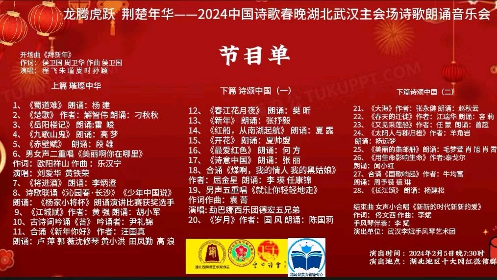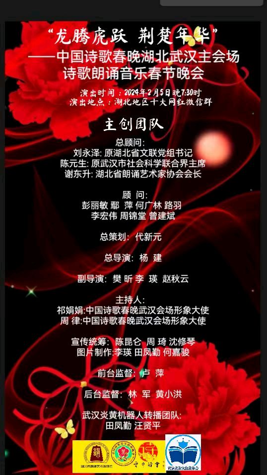 祝中国诗歌春晚越办越好!预祝“龙腾虎跃 荆楚年华———2024中国诗歌春晚武汉湖北武汉主会场诗歌朗诵音乐会”圆满成功!