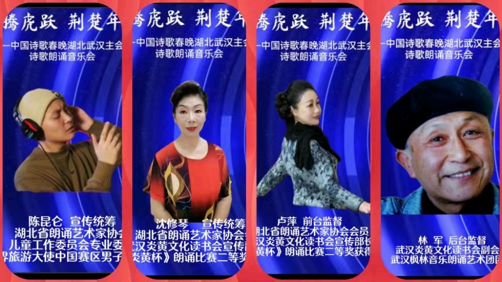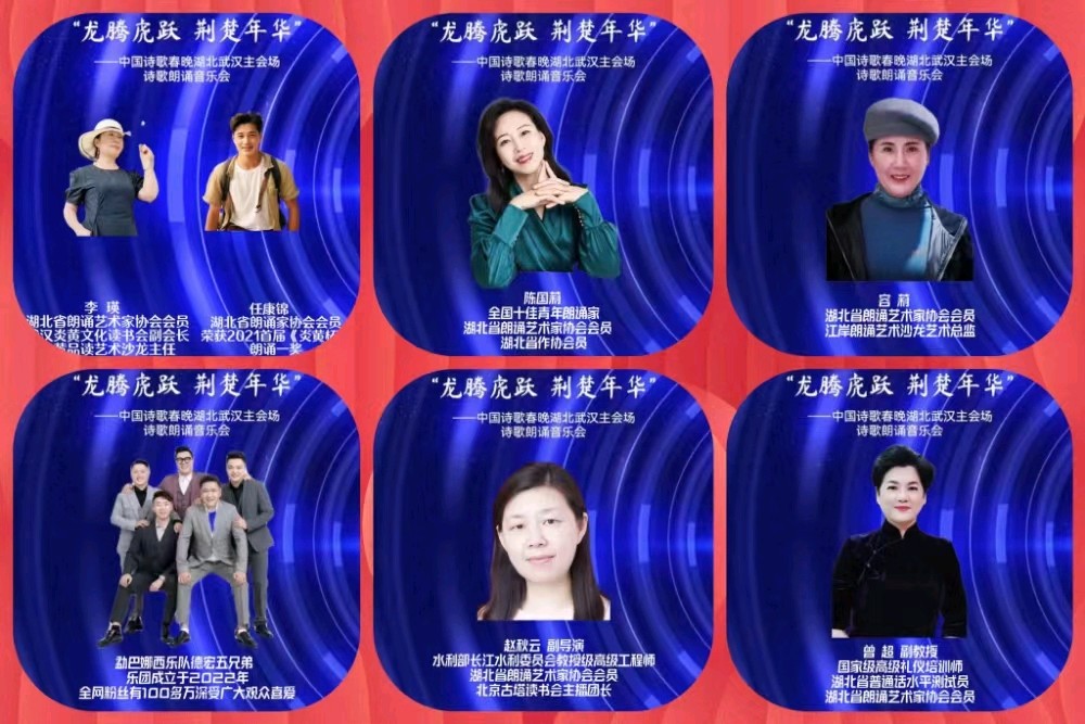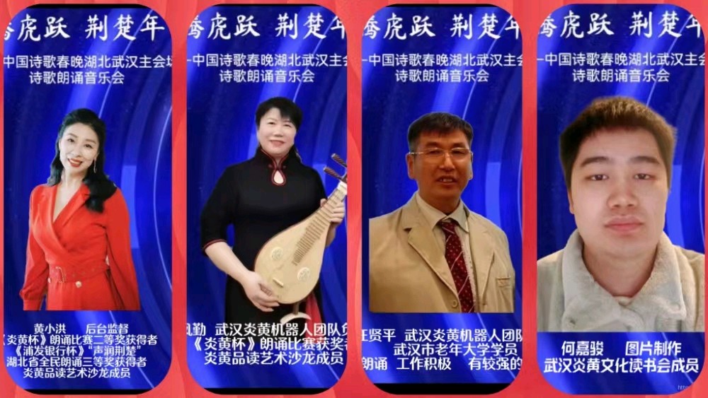 这是一次作家、诗人、朗诵艺术家和朗诵爱好者的聚会。2月5日晚将为大家献上一台丰盛的文化大餐。出席本次活动的演员中聚集了一大批湖北省和武汉市文艺界颇具影响力的知名专业播音工作者和演员;还有颇有建树的业余爱好者,他们中有教授、高级工程师、退役军官、高级教师、医务工作者、各行业退休人员、在校大学生、中学生、小学生;有师生同台的 、有母子同台的、有同窗同台的、有好友同台的;这是一次践行党的二十大精神,增强文化自信的盛会,这是一次全民阅读的精神大餐。本次诗会的作品有千古绝唱的古诗词、有缠绵悱恻的爱情诗篇,有慷慨激昂的红色经典,有保护环境志愿者的呼声,还有知名歌唱家为大家带来欢快喜悦、年味十足的歌曲。