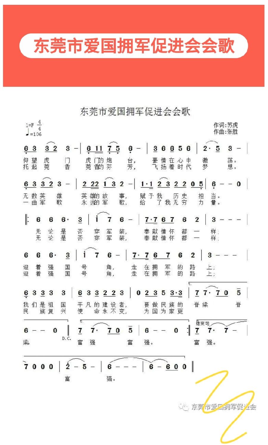 东莞市爱国拥军会歌分别由著名作词人苏虎填词和著名作曲家张胜谱曲,词曲恢弘大气、铿锵有力、振奋人心。体现着东莞市爱国拥军促进会高举爱国拥军旗帜,激发爱国拥军热情,凝聚爱国拥军力量,为政府分忧,为国防效力,为军烈属解难,为退役军人服务。努力把本会打造成弘扬爱国主义精神的窗口,民间爱国拥军的平台,退役军人的贴心人,会员的娘家,政府与退役军人沟通的桥梁;成为全国一流的市爱国拥军促进会,为提升东莞正能量,助推东莞高水平崛起,建设和谐东莞、幸福东莞奉献力量,为东莞这座有着光荣历史传统的双拥模范城增光添彩!
