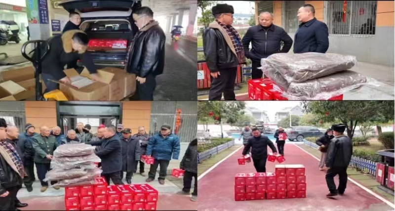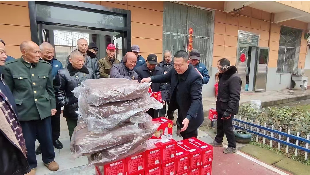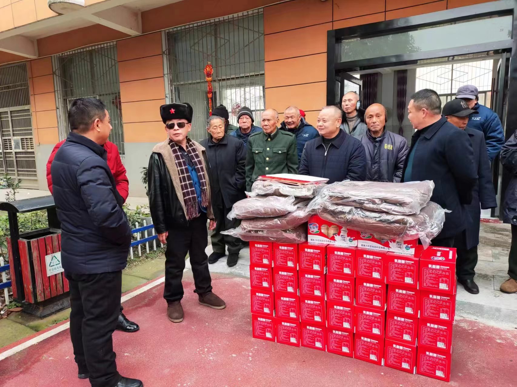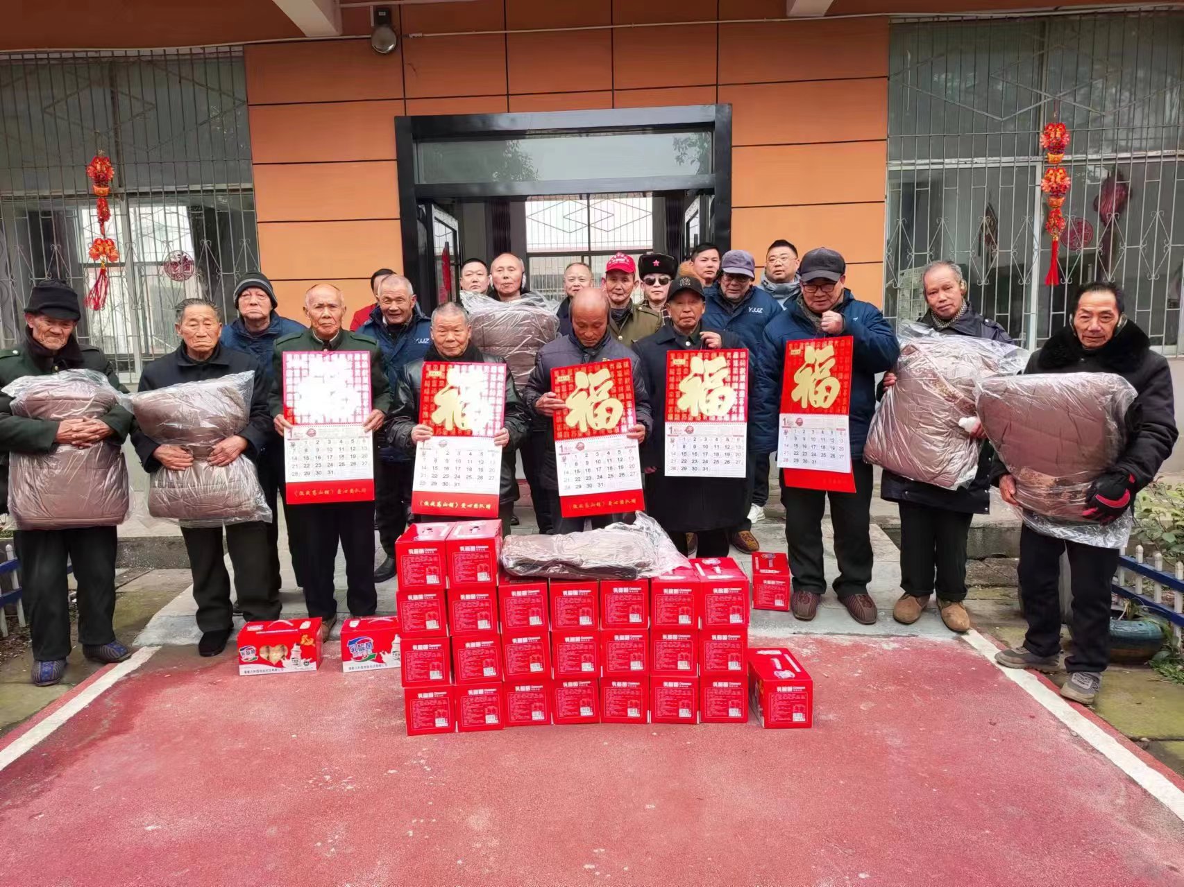 湖北省″双军"模范家庭家长周松深情地对在场各位老人说:″他代表正在部队服现役的儿子儿媳来给各位前辈拜年。送来的军大衣给大家保暖,送来的《激战高山铺》挂历是让红色文化革命传统文化代代相传。我们全家老小要时刻跟党走,听党话,为民办实事"。