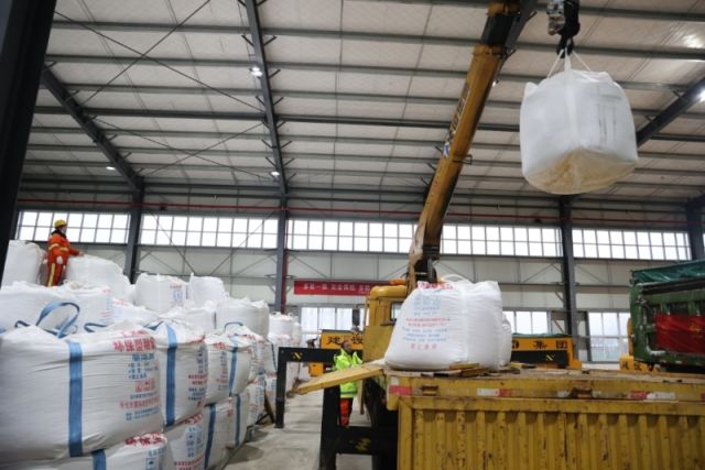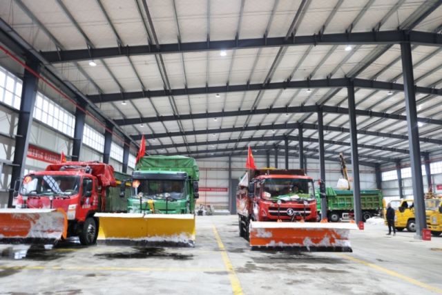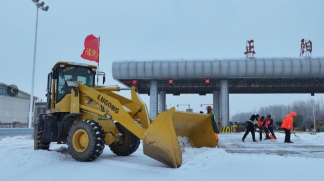 2月20日中午,在高速公路正阳南收费站养护工区,我们看到工人正在用吊机往除雪保通车吊运融雪剂,一排排保通车和清扫车排列整齐,整装待发。