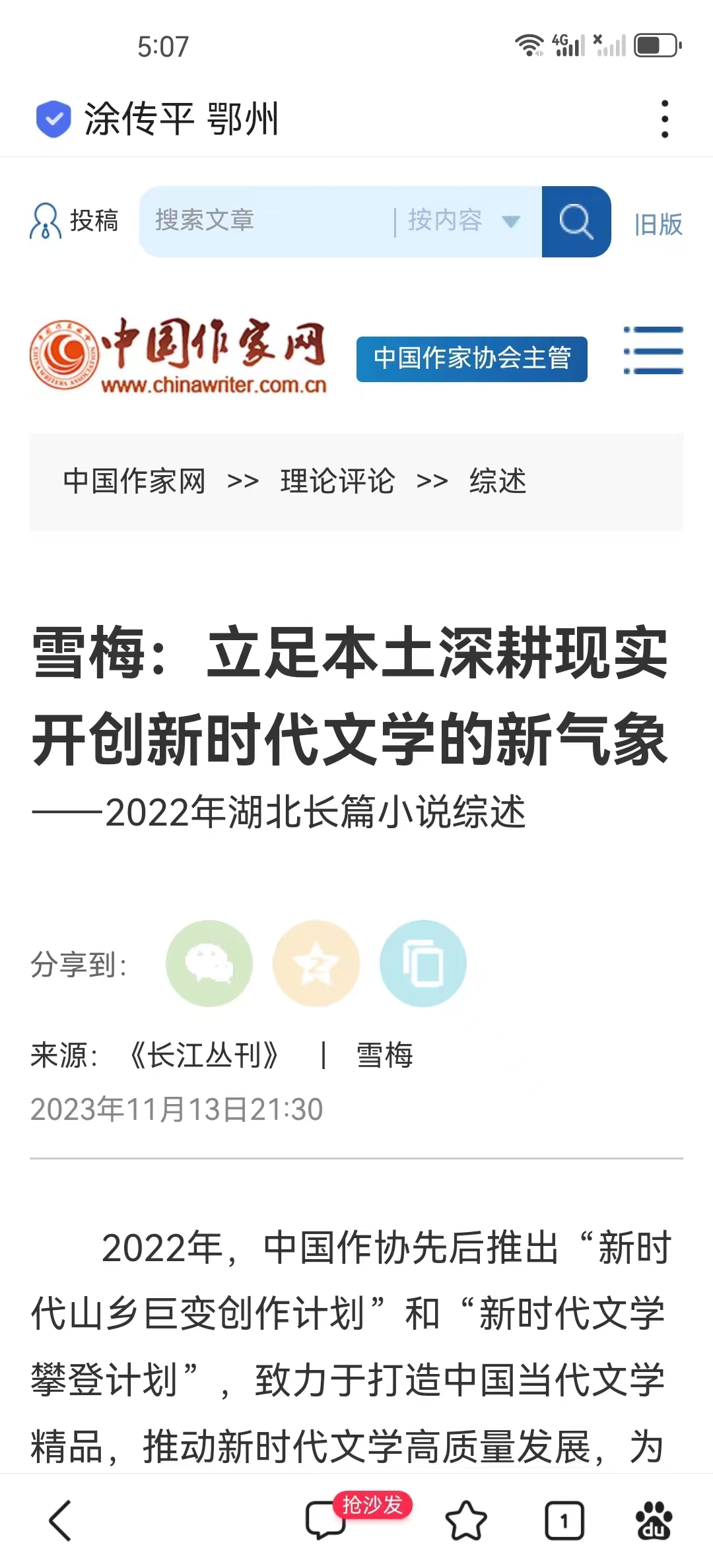 雪梅巜立足本土深耕现实,开创新时代文学的新气象2022年湖北长篇小说综述》的文学评论在中国作家网上发表,对著名作家陈应松《天露湾》等人的作品进行了评论。涂传平巜梁子湖少女》的书评位列其中。