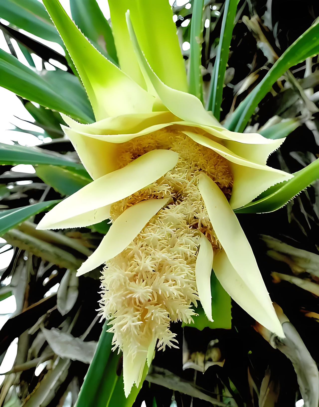可能时间不太吻合,在海南猫冬的五六年里,看到的都是露兜树的青果。这种悬垂、青绿色,圆形或长圆形的聚花果,表面长有粗毛和一个个隆起,挂在树上远看像“地雷”,近看似菠萝,可爱又好玩。至于发黄成熟的果子,既没看到更没吃过,因为不到成熟期我就回北方了。需要提醒大家的是,在观看或打理露兜树时,要特别小心它的叶子。这种带状发涩的叶子,两边和脊背中脉生有尖锐的锯齿,蹭到身上会划伤皮肤。前几天拍照,不小心给划破了手背,转身过程又被它刺伤了耳朵,发木发痛了好几天。