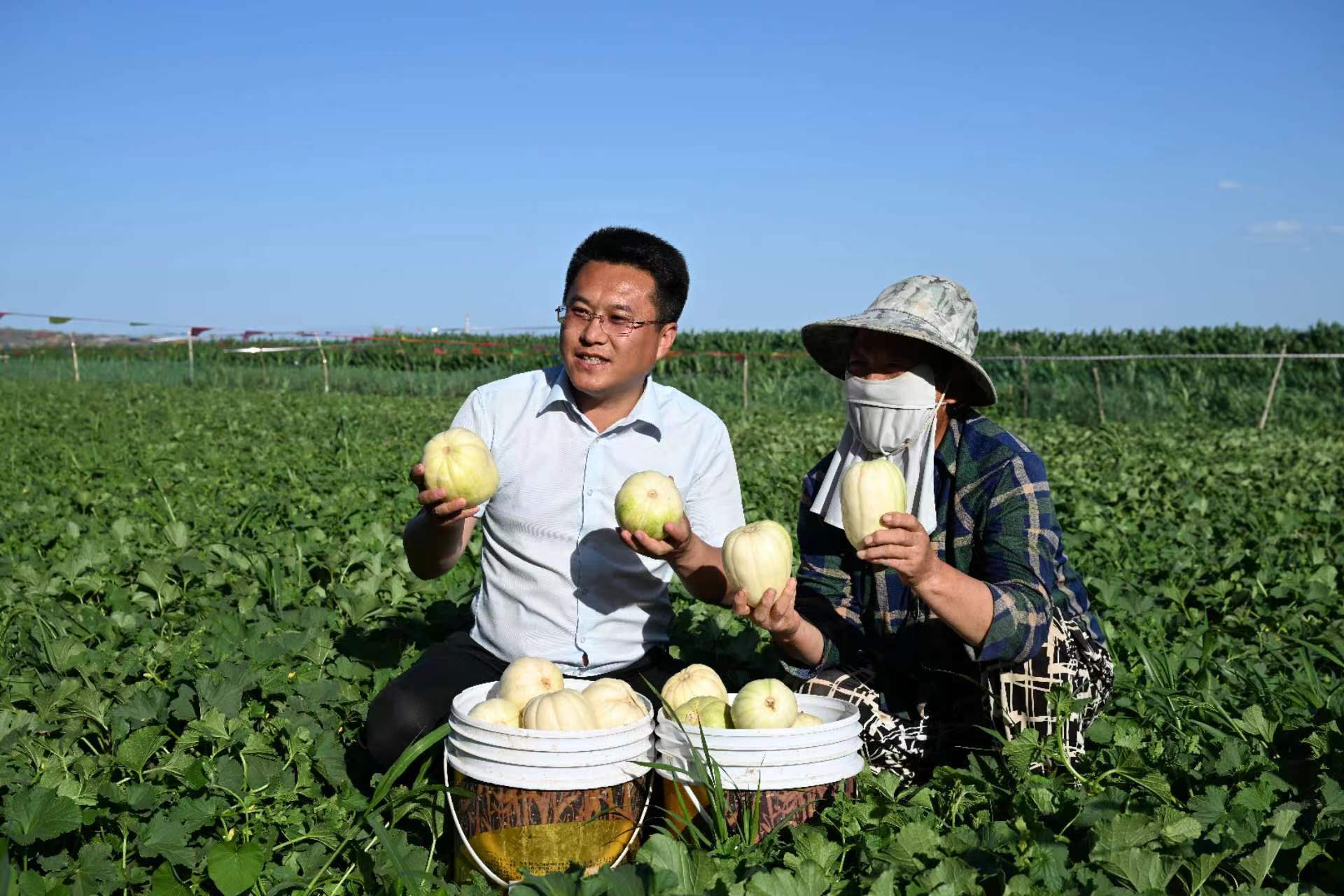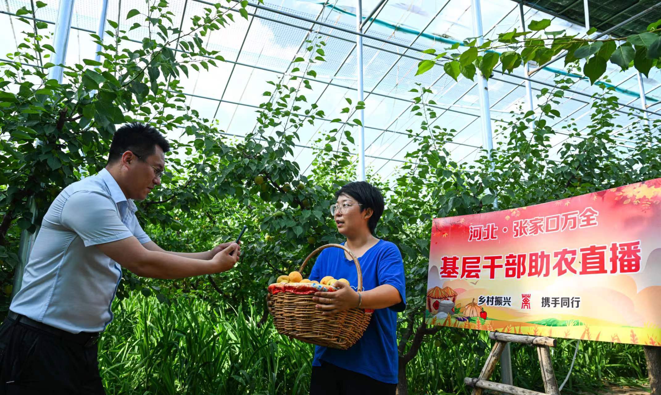 图为邢鹏飞和农户拍摄卖香瓜视频。(资料图)万全区委宣传部供图