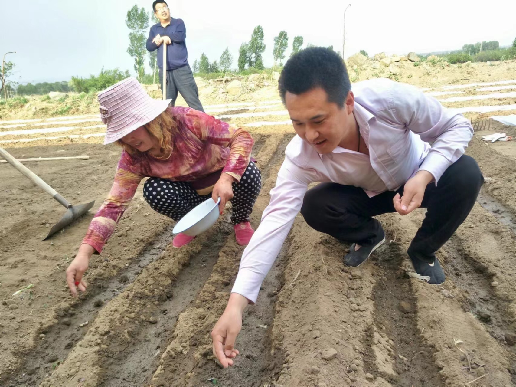 图为邢鹏飞和村民一起种地。万全区委宣传部 供图