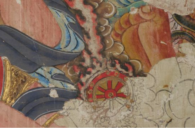 而在西壁北侧壁画脱落处,发现里面也有一层只勾了墨线没有施色的壁画。并且里外两层壁画中的形象出入较大,内层画的是伸着胳膊,拿着佛尘的人物,而外层画的则是抬着胳膊,拿着毛笔的人物。在“金木水火土五德星君”北侧那组,内层画的是云,外层表现的却是人物头部。