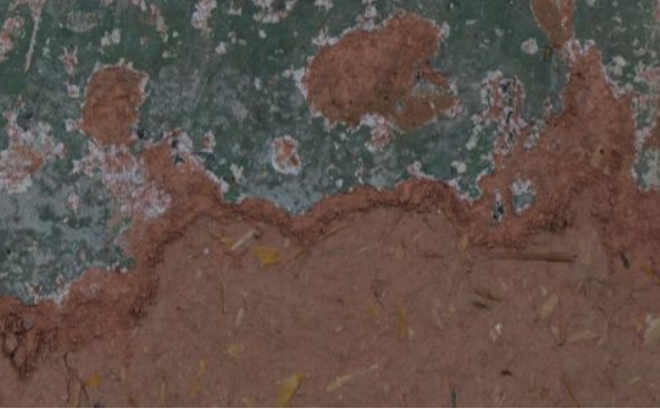 在东、西壁及南壁脱落处,可以看到,在草拌泥的外面还有一层,由纸浆和黄沙土组成,最外面刷了一层白垩土,薄如蛋壳,那壁画便是直接画在它上面的。