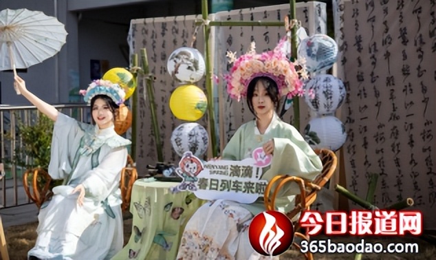 在活动现场,书院师生们自由点歌,用歌声表达自我。各类美酒在调酒师李秀顺同学的调制下混成一杯多彩可口的鸡尾酒,美食工坊“大厨”任桐泽同学正亲手为大家制作泰安特色美食——煎饼春卷,并邀请师生共同参与制作体验。除此之外,水拓丝巾,创意葫芦绘画、“人人都是坐家”木工诗作、多肉盆栽、植物拓印、街头写生等摊位汇成了独属于书院的景致。现场也布置簪花古风背景,为师生免费装扮拍照,留下传统韵味的春日影像。最有意思的是,一辆“开往春天的列车”在汶阳书院始发,带领师生春游泰科校园!300余名学生乘坐小火车穿行至校园各处,火车上的师生与校园中的伙伴热情挥手,随着火车的行驶,热闹的操场,校园的角落,都承载着春日满满的喜悦与感动!。行政管理学院/五汶书院熊佳琪同学化身专列导游与大家热情互动,现场气氛热烈。来自汶阳书院的全生异科导师高萌老师说道:“很开心能带着异科学生一起参加踏青节活动,戴上簪花,穿上汉服,体验中华传统服饰之美,很有意境。”来自海右书院/行政管理学院的储文静同学感慨道:“参与这次活动,我深感充实与满足,书院的热情,让我感受到家的温暖,各工坊的独特个性也给我带来惊喜,它们各具特色,太有意思了!”