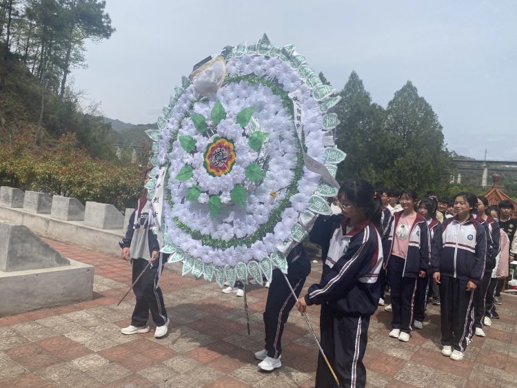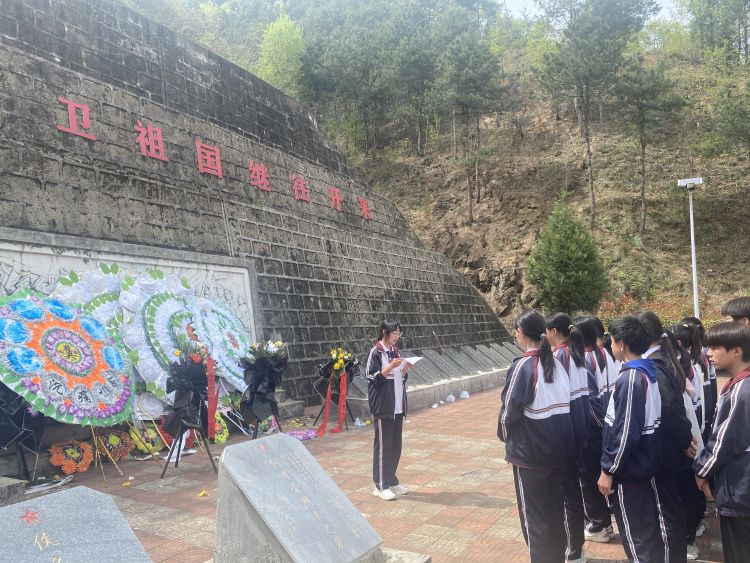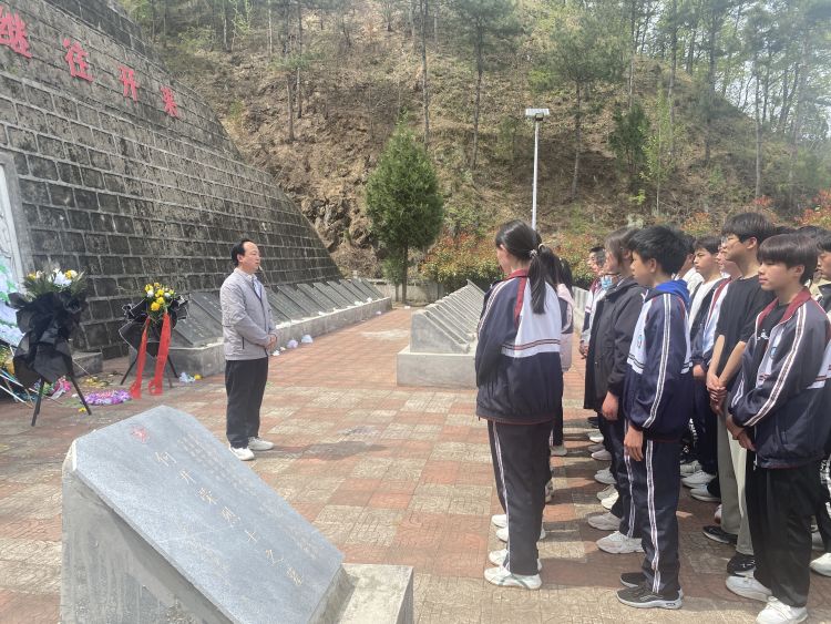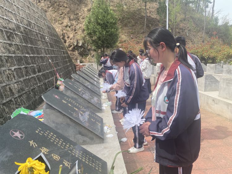 4月8日下午,天清气朗,乾坤浩荡。同学们穿着整齐的校服,手握白色或黄色的菊花,怀着崇敬的心情,迈着坚定的步伐,跟随老师一起来到铁峪铺镇寺底铺烈士陵园祭奠英雄,缅怀先烈。烈士陵园里松柏苍翠,庄严肃穆。默哀、献花、瞻仰纪念碑……老师和学生们们用庄严的方式向先烈们表达着无比的敬仰和无限的哀思。