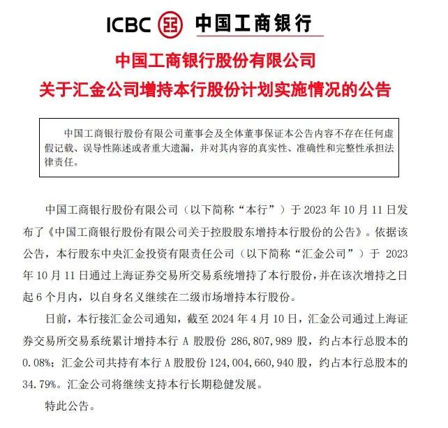 工商银行公告称,截至2024年4月10日,汇金公司通过上海证券交易所交易系统累计增持本行A股股份286,807,989股,约占本行总股本的0.08%;汇金公司共持有本行A股股份124,004,660,940股,约占本行总股本的34.79%。