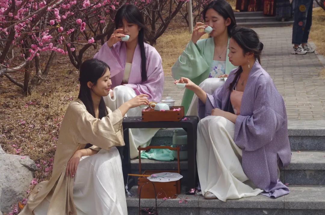 在花香与茶香中,与志同道合的朋友共赏汉服之美,同叙春日情怀。