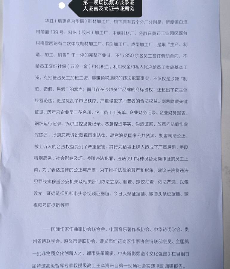 华胜、华瑞不与5个分厂的一线员工签订劳动合同、不给员工交纳五险一金、克扣侵占员工超时加班费、没有双休日、没有节假日、没有年休假、捏造事实、编造证据、向法庭作虚假陈述、妨碍司法公正、恶意浪费国家司法资源、利用现金和个人账户给一线各分厂共计350余名员工发放工资和年终奖、涉嫌违法犯罪、华胜华瑞一个个体工商户营业执照旗下拥有5个不同场地的集“产、供、销”一条龙服务的黑色产业供应链、涉嫌严重违法、扰乱了市场秩序、严重超出了主体经营范围、强烈建议法院依法移送公安机关和相关的执法部门依法依规深挖彻查、依法严惩、以儆效尤!