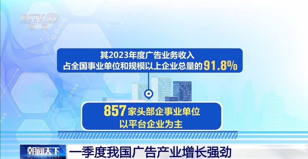 市场监管总局公布数据显示,一季度857家头部企事业单位共实现广告业务收入2740.6亿元,同比增长13.6%。