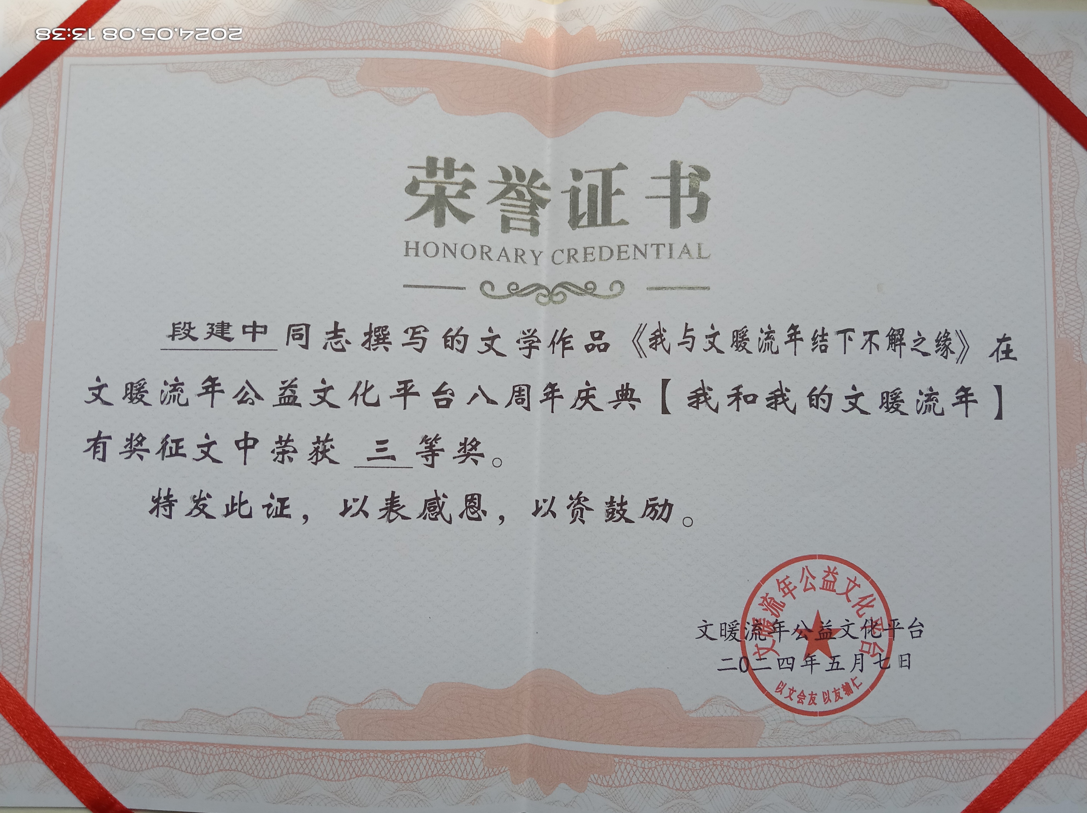 序:巩义市文暖流年公益文化平台成立八周年庆典暨“我和我的文暖流年”有奖征文颁奖典礼,于2024年5月8日在巩义市东区文化广场新时代文明实践中心举行,本人的三篇作品分别荣获一个三等奖和两个优秀奖,激动之余特写诗文一首,抒发一下感慨之情: