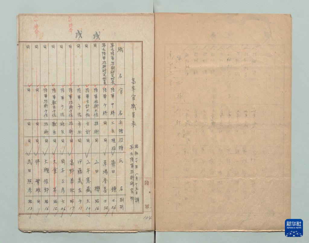 这是日本国立公文书馆藏《陆军第九陆军技术研究所高等官职员表(1945年8月15日制)》原始档案首页。新华社发(受访者供图)