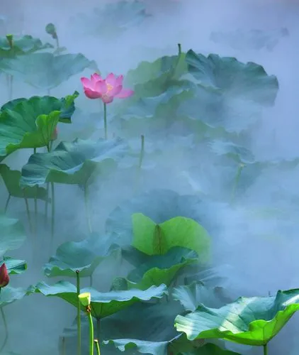 远天浓云冠红丹。映塘嫙,荷韵漫。滴跳涟漪,溢彩尽开颜。瀛飞来双凤羽,烟水梦,笔花翻。