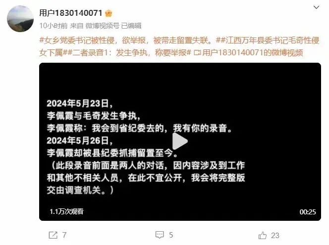 未料李佩霞留有后手,据她父亲李长柳实名举报后告诉记者,5月23日,李佩霞与县委书记毛奇发生争执并声称要去省纪委监委举报毛奇,5月26日李佩霞被万年县纪委监委带走的,随后县纪委监委来到家中查抄,李佩霞被带走前曾给家人留下一个U盘,并嘱咐这个U盘能救她的命。