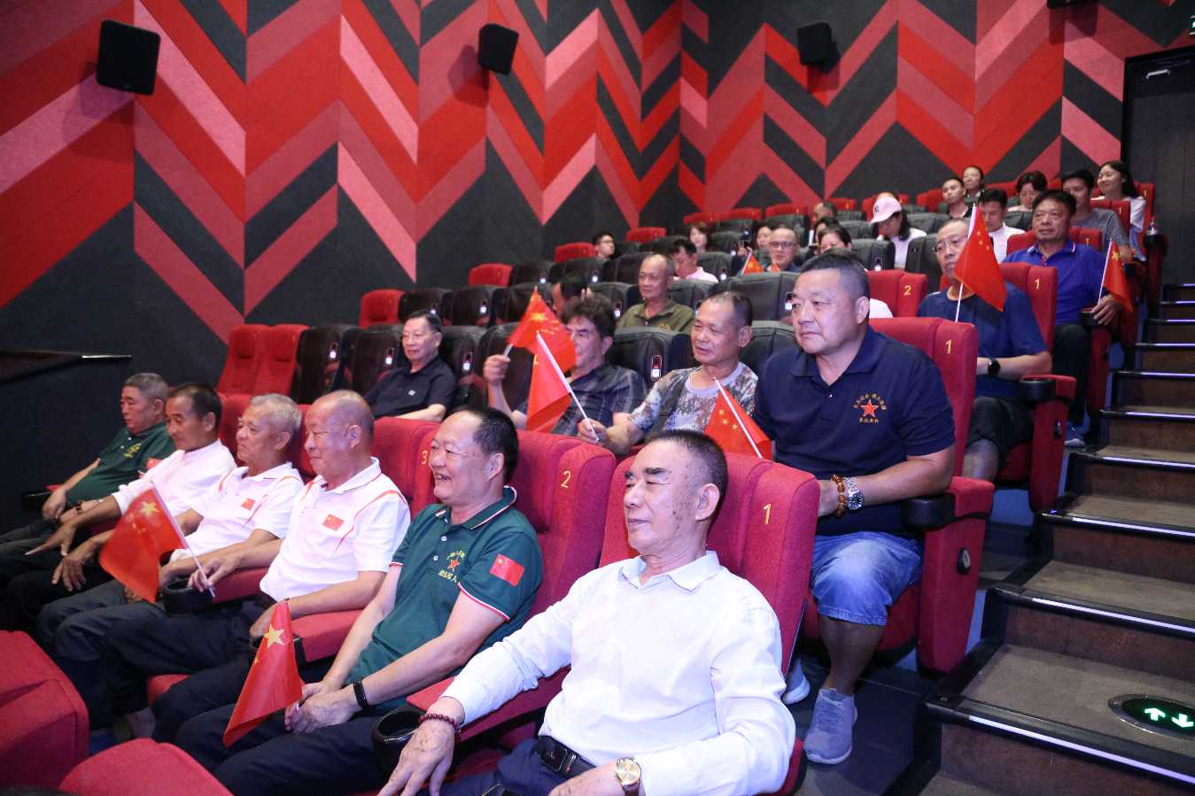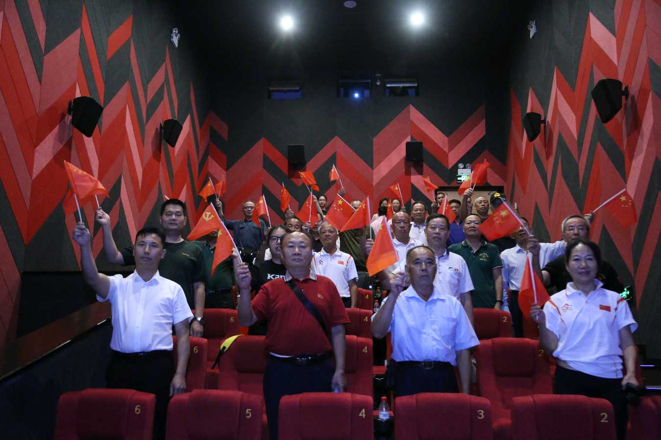 片尾曲响起,他们纷纷起立,情不自禁的挥动着手中的小国旗,齐声高歌《我和我的祖国》,瞬间点燃了现场气氛,那激昂的旋律中满是澎湃的爱国之情。